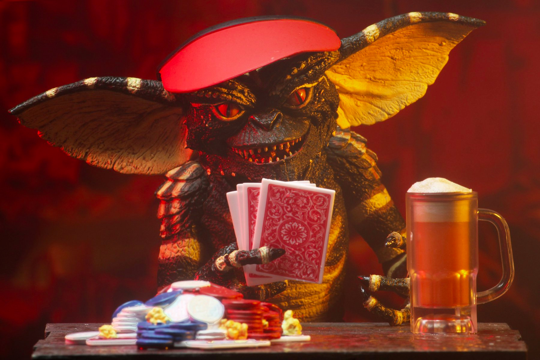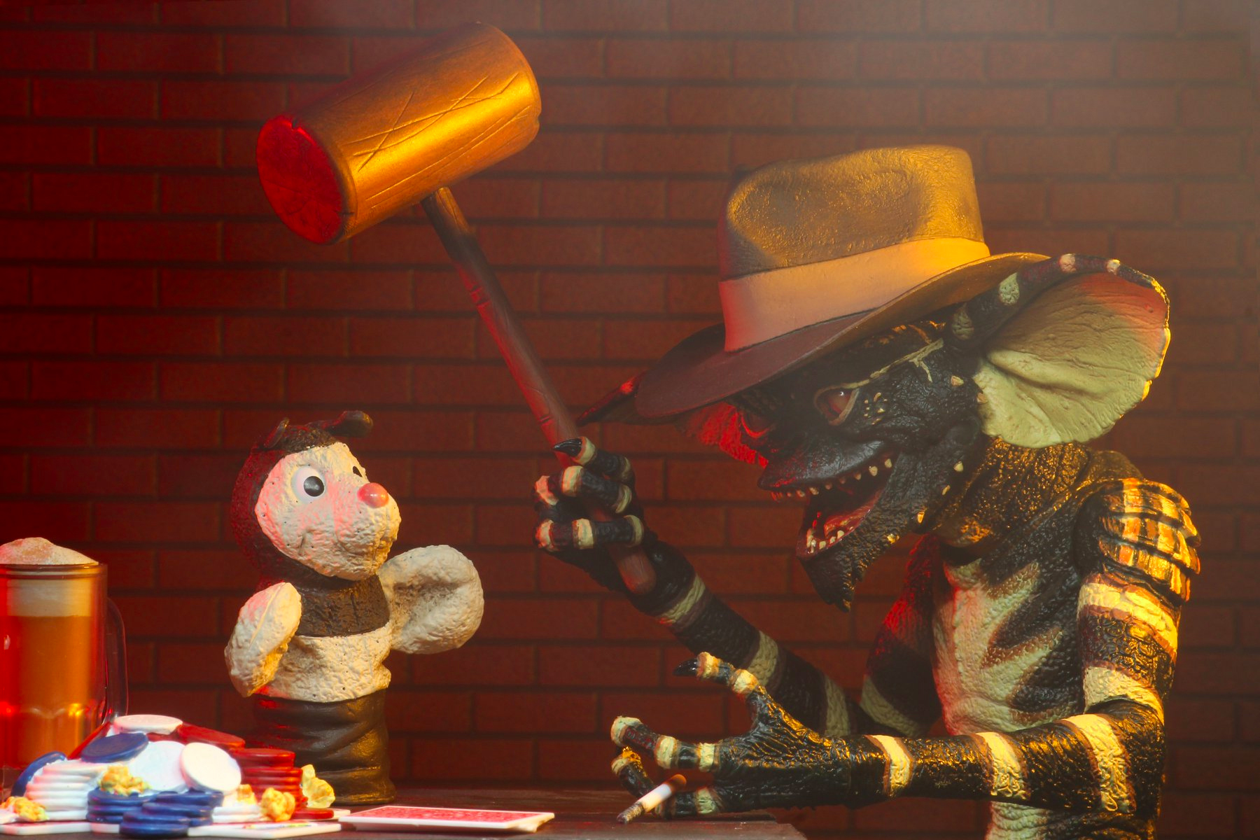 Based off of the Dorry's Tavern scene in Gremlins, the Flasher Gremlin comes equipped with a removable fabric trench coat. Not only that, he is super loaded with new accessories, including a poker visor, poker chips, mallet, puppet, fedora, bowtie, and more, allowing you to recreate the looks of other Gremlins from the film!