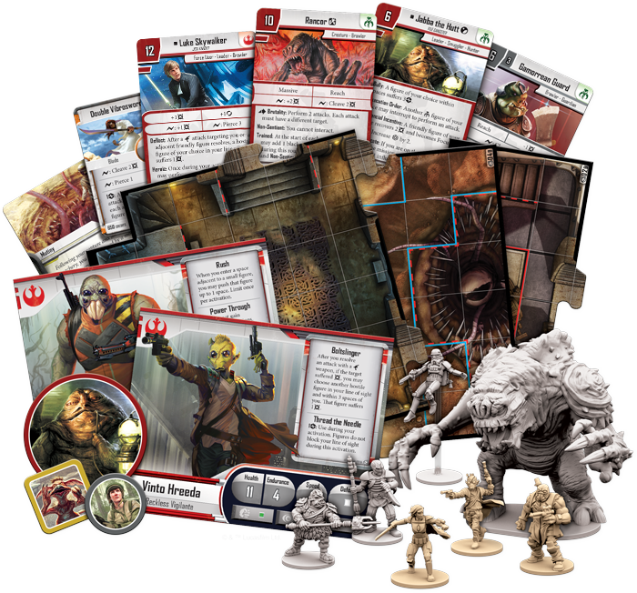 As impressive as X-Wing and Armada are, they don't draw gasps quite like Star Wars: Imperial Assault, the sprawling dungeon crawl campaign/sandbox skirmisher that keeps on adding more and more gorgeous plastic miniatures to its line-up. As expected, FFG announced a new small box expansion, titled Jabba's Realm, which adds characters and locations from the opening act of Return of the Jedi to the fray. Like previous expansions, this box will include new heroes, new villains, and a fresh campaign storyline that will force you to rub elbows with the Hutt family. And yes, there is a Rancor in that box. Here's more straight from FFG: