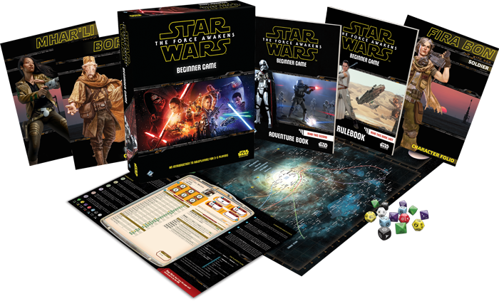 And finally, we arrive at the new Star Wars: The Force Awakens Roleplaying Game, which will allow gamers to journey throughout the galaxy and follow in the footsteps of Rey and Finn. FFG has been emphasizing the Beginner Game box, which is designed to ease newcomers to the RPG realm into the game and its systems. Here's how they describe the introductory game, Discovery on Jakku, which will teach players the game as they play:
