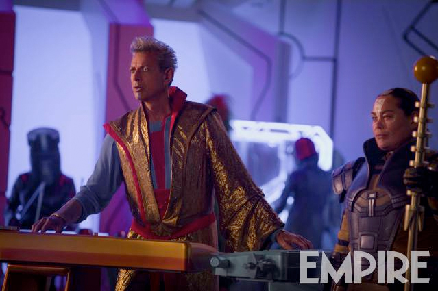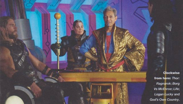 First of all, take note of the image where The Grandmaster (Jeff Goldblum) is standing at a control center with Topaz (Rachel House of Hunt for the Wilderpeople) on his right. They have Thor himself presented in front of him, restrained in some kind of chair. This looks to be at the end of one of the scenes that was shown to us at San Diego Comic-Con, where Thor is sitting in a chair that moves through a holographic display that explains the origin of Sakaar and its ruler, The Grandmaster. It's a sequence that takes a cue from the scary boat ride from Willy Wonka and the Chocolate Factory, containing exposition presented in an entertaining way.