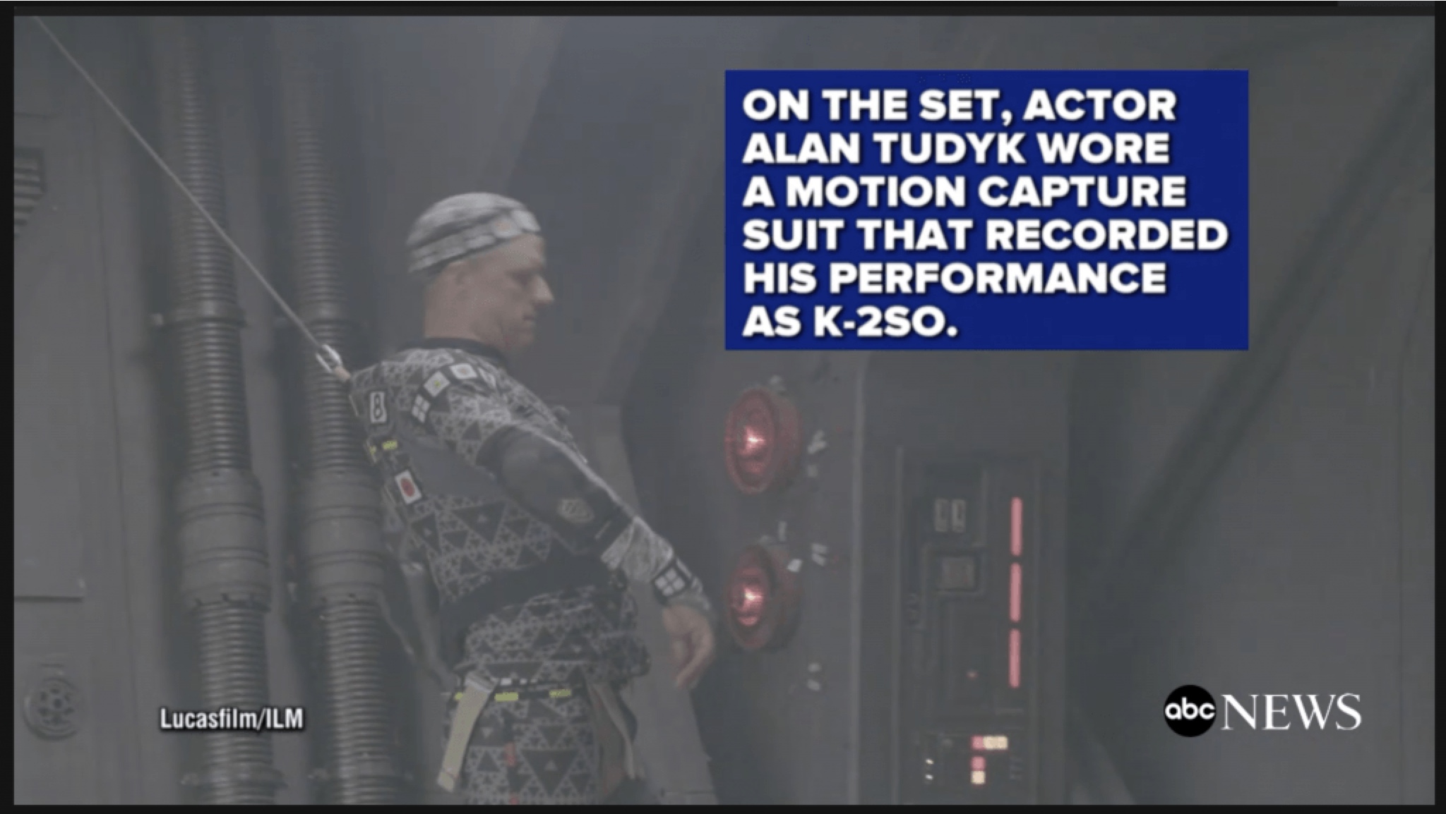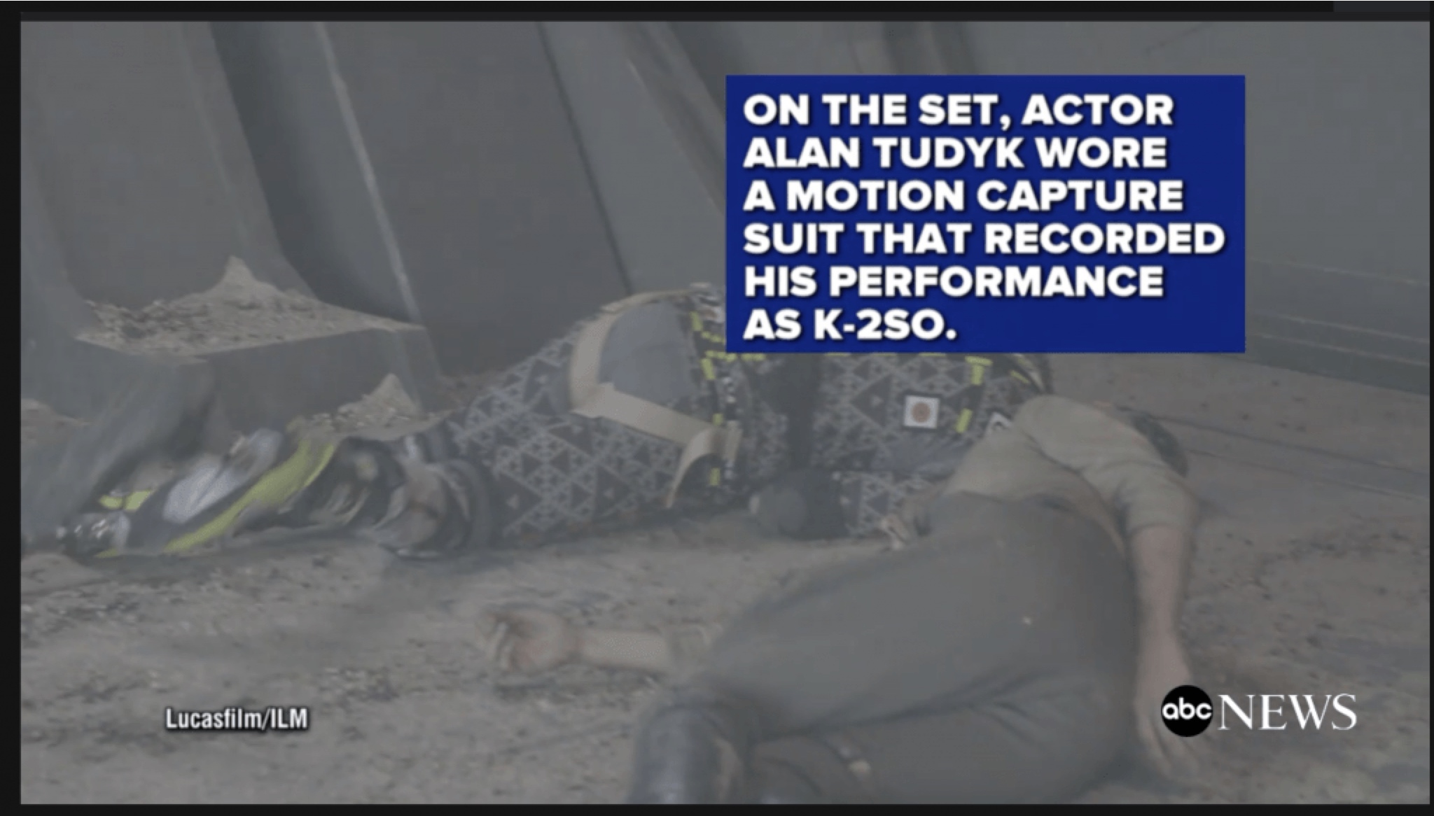 The new ABC footage shows Alan Tudyk in his K-2SO performance capture suit going down in a blaze of glory next to what appears to be a unmoving Cassian Andor. They are in front of an Imperial door on the dirty beach, and not outside the vault room in the movie.