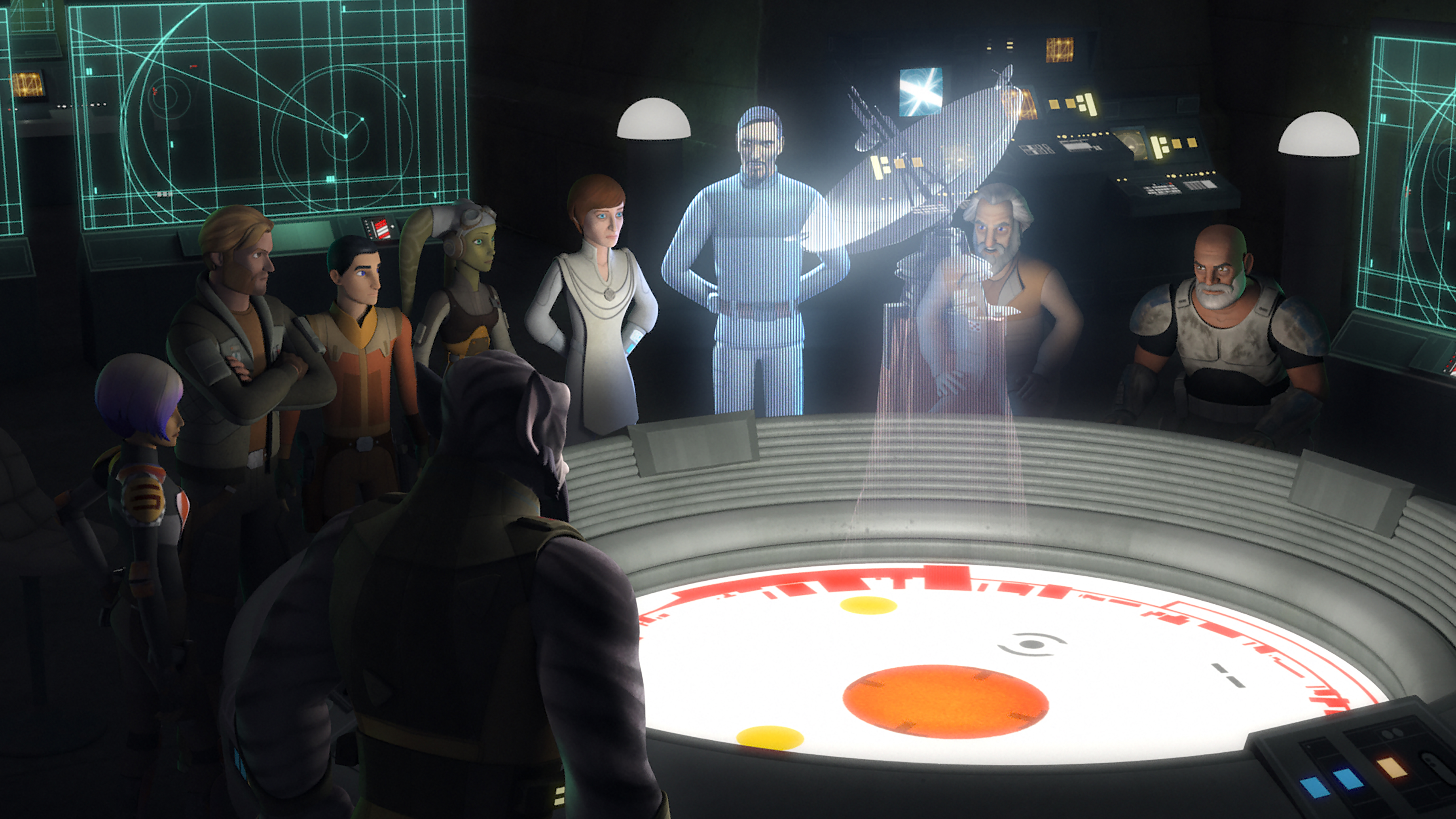 Here's a quick clip of Saw appearing in hologram form as he butts heads with Mon Mothma: