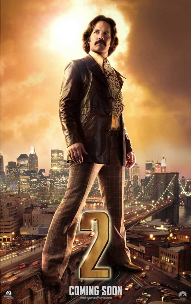 Ron Burgundy's declaration that he's "kind of a big deal" gets quite literal in these new character posters from the Adam McKay-directed Anchorman 2: The Legend Continues. Ron (Will Ferrell), Brian Fantana (Paul Rudd), Champ Kind (David Koechner), and Brick Tamland (Steve Carell) are blown up to Godzilla-like proportions, all the better to take the city by storm.