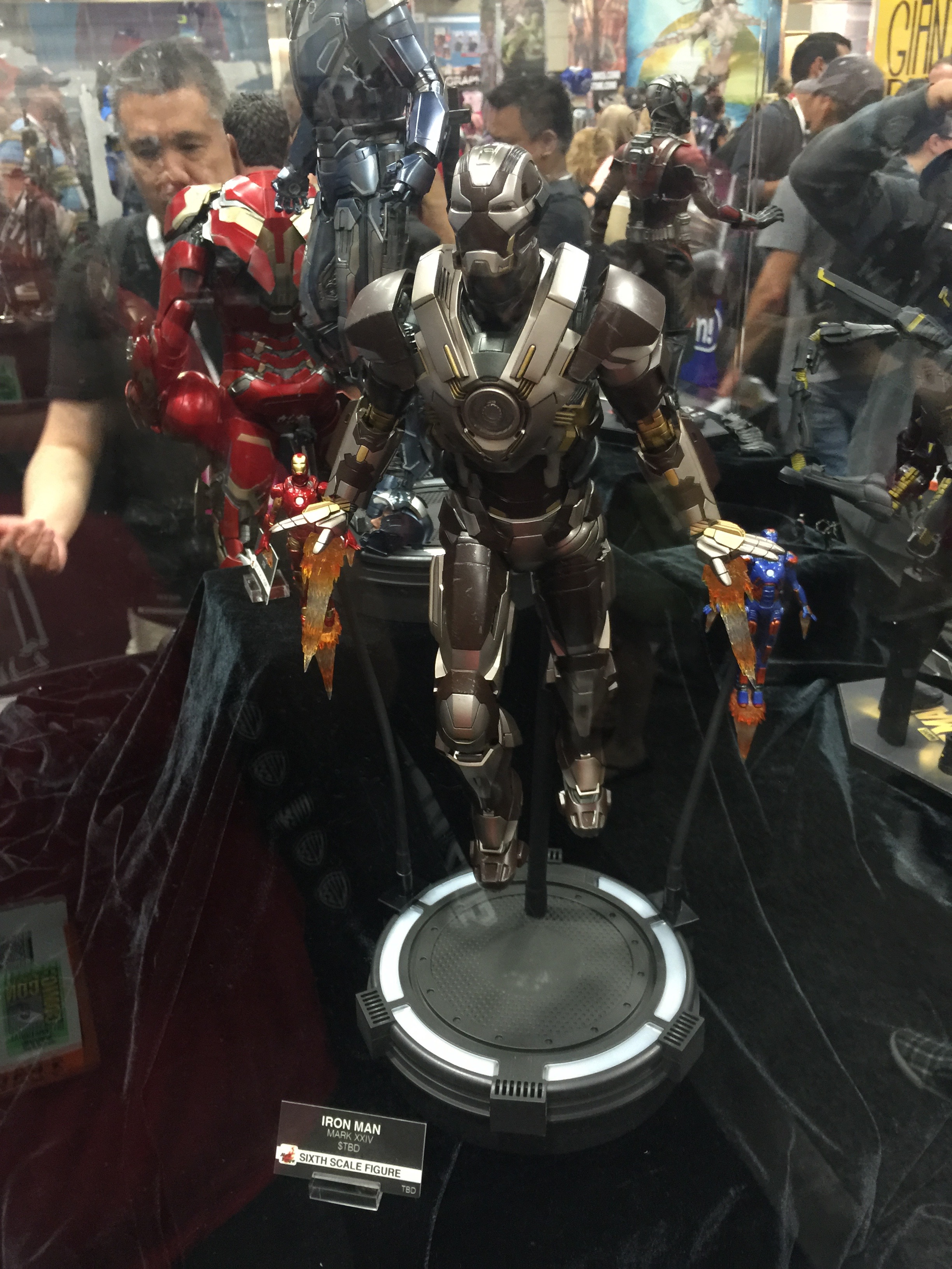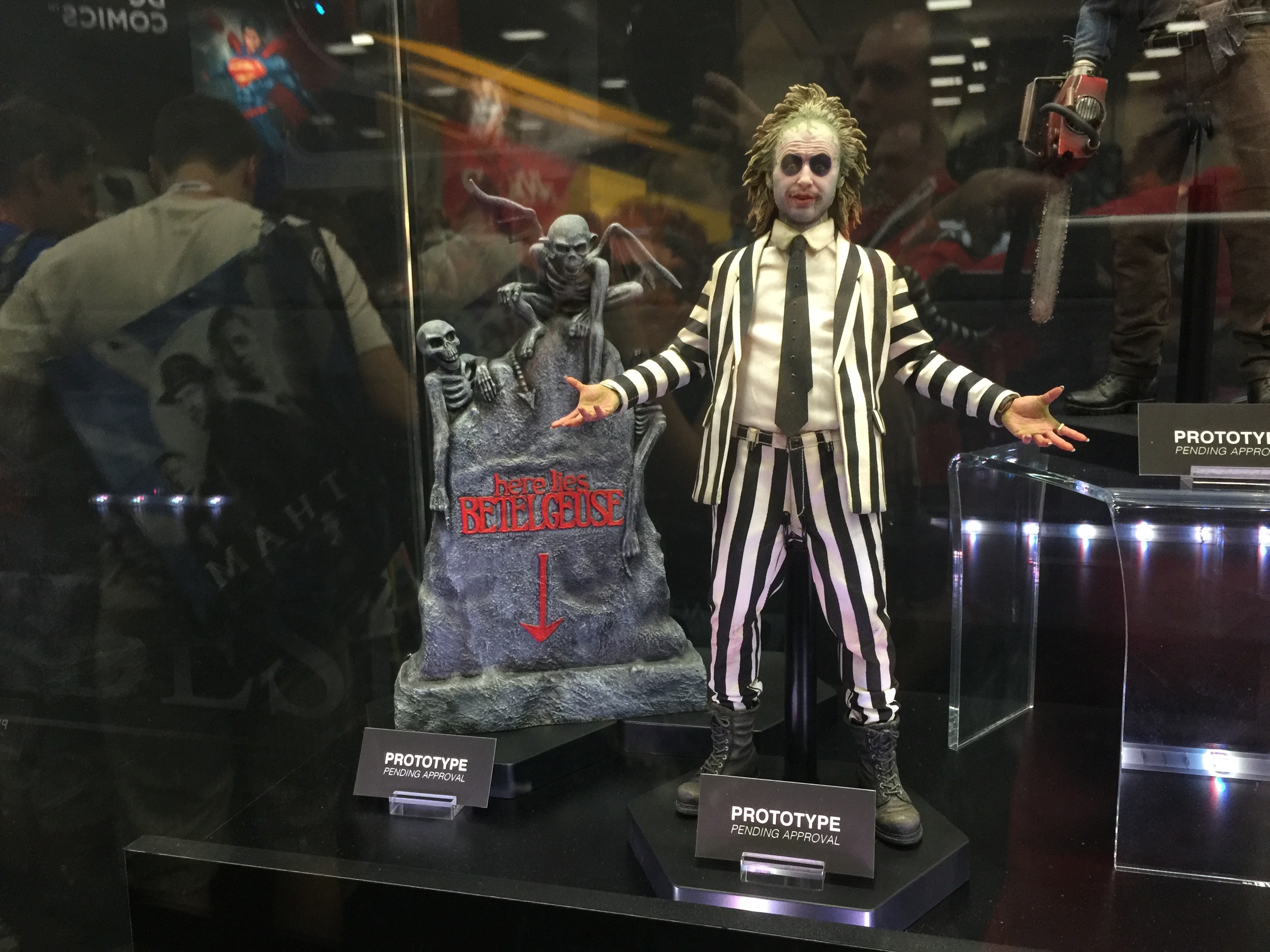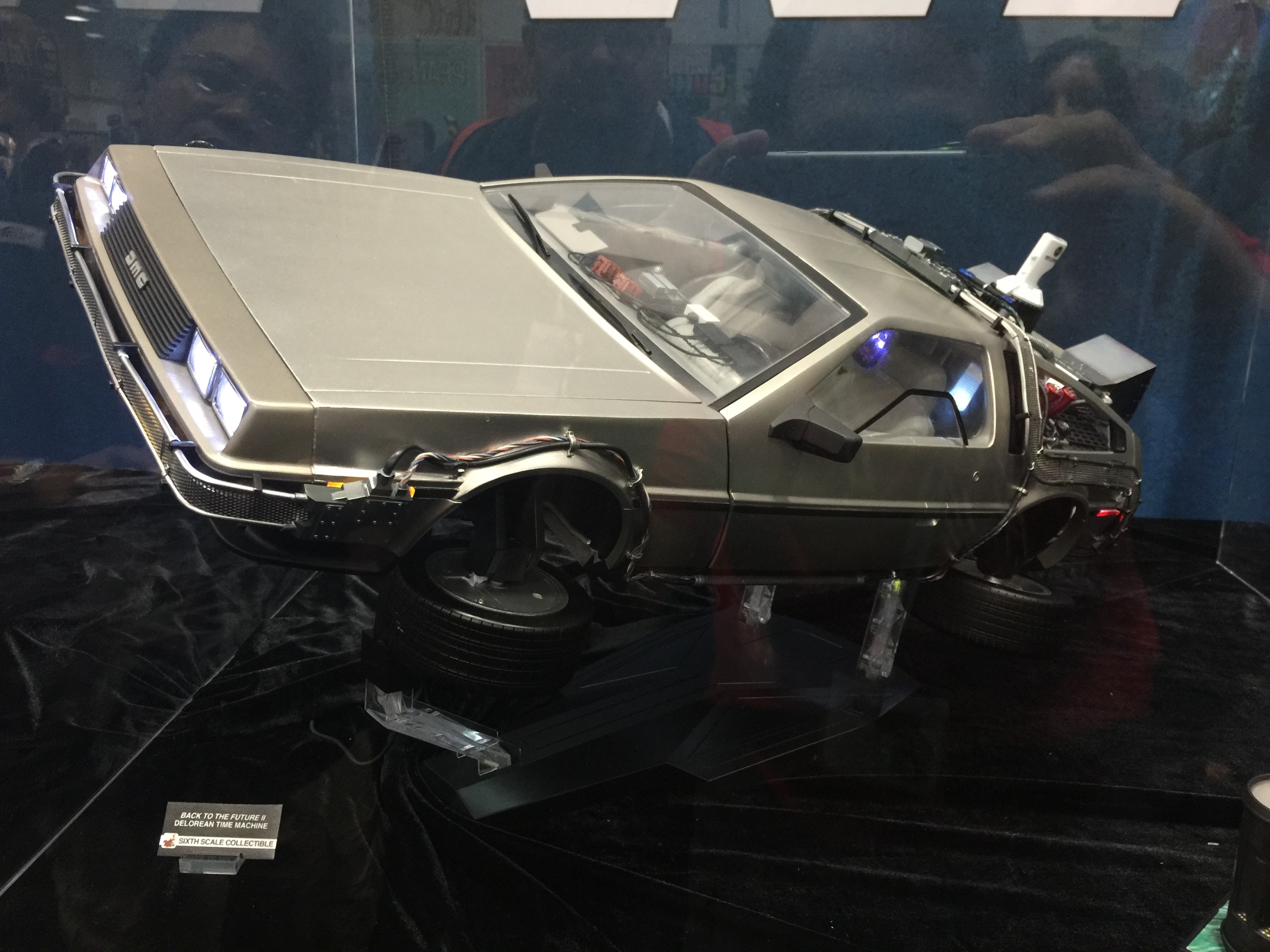 Thats's right, a sixth scale Delorean time machine from Back to the Future Part 2, complete with flying mode wheels and Mr. Fusion. I can't impress upon you how massive this collectible is. Also a new sixth scale Marty McFly figure was displayed with the Back to the Future Part II Marty Jr future outfit, complete with self tying Nike sneakers, a Mattel hoverboard, and the gym bag for the sneakers.
