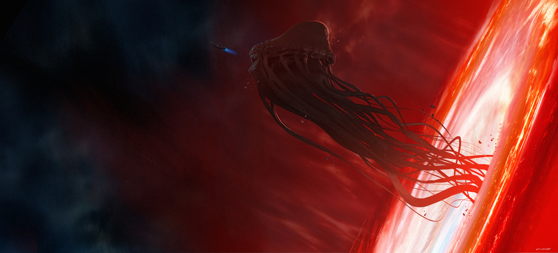 44. SUMMA-VERMINOTH, the creature the falcon encounters in the Maelstrom had a long road to the screen. In the earliest drafts, the Kessel Run was interrupted with a forced pit stop on a spooky Ridley Scott-type planet. On that Nameless Planet, Beckett's crew encounters enormous Lovecraftian monsters that claim one of their number. When C&P got involved, they determined (correctly) that that pit-stop would kill the momentum of the Kessel Run. Later, when working on the sequence with RH, the notion of a Lovecraftian monster returned (as we are both huge Lovecraft fans). I remember KK would go into her office and google images Frilled Sharks and giant squids for reference. She loves that stuff. One thing we stumbled across while working on this was a fantastic short film/teaser directed Ruairi Robinson called The Leviathan. You can find it on YouTube and Vimeo. It has been long-rumored to be turned into a feature and I sincerely hope it will be. The name Summa-verminoth is another Cthulhu mythos homage to Robert Bloch's fictional tome, De Vermis Mysteriis.