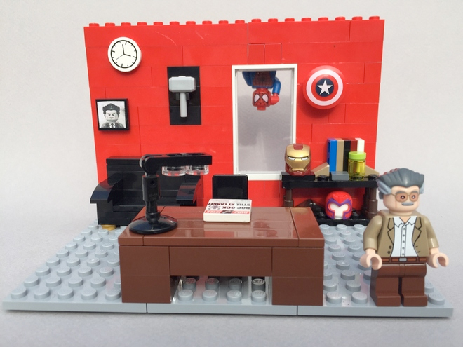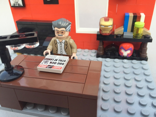 The second set, on the other hand, is a pretty cool little mini set that would be a nice release at Comic-Con or something like that. It's Stan Lee's office, complete with Spider-Man, Iron Man's helmet, Captain America's shield, Magneto's helmet, Thor's hammer, a Daily Bugle newspaper that says Doc Ock is still at large, and a photo of Jack Kirby.