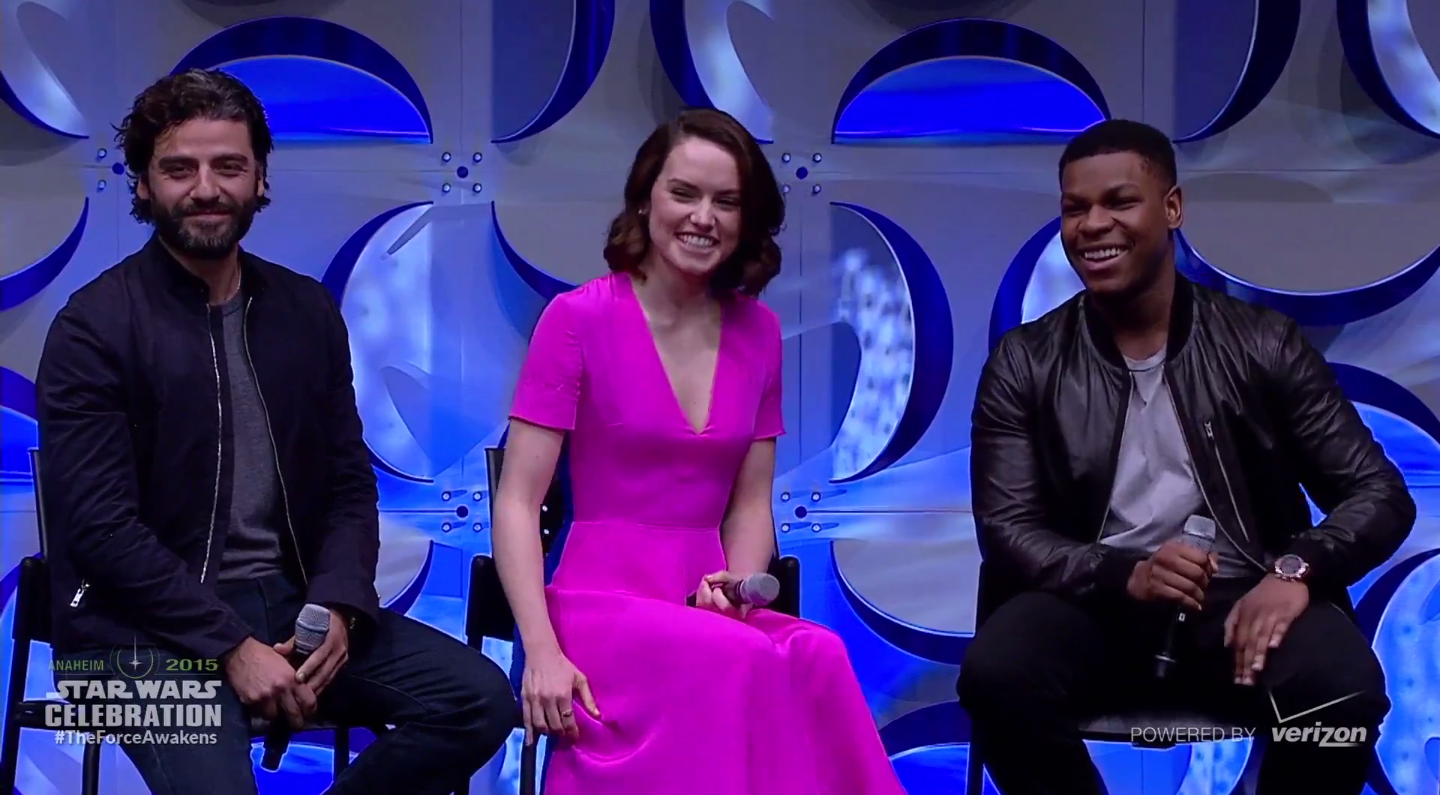 Daisy Ridley on Rey: "She is a scavenger in a ship graveyard. She is very solitary until she meets another character, and an adventure begins."John Boyega on Fin: "He's in incredible danger, and the way he reacts changes his life, number one, and launches him into the Star Wars universe in a very unique way." Pressed for more details, Boyega joked, "my memory's just gone."Oscar Isaac on Poe Damreon: "He's the best frickin' pilot in the galaxy, that's who he is. He's been sent on mission by certain princess. He ends up coming across John Boyega's character and their fates are forever intertwined."