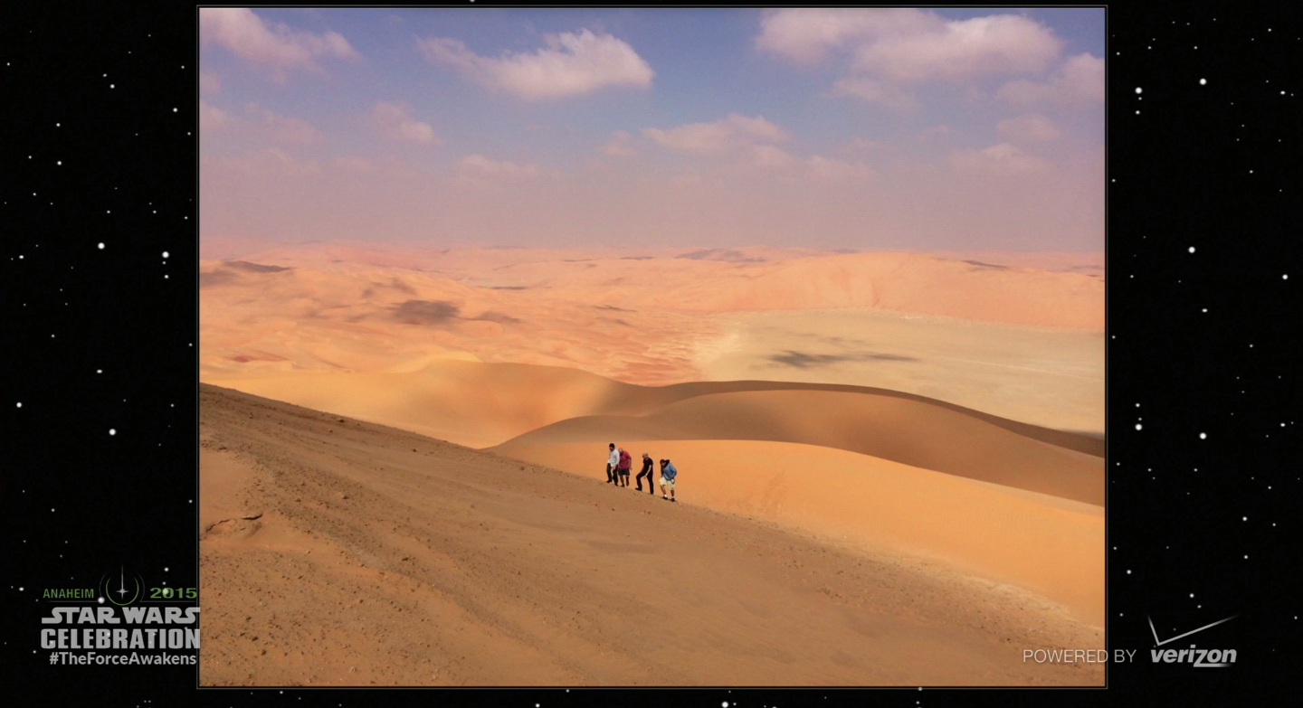 That decision also took them to some far-flung locations, like Abu Dhabi — which stood in for the planet of Jakku, not Tatooine as previously rumored. Though the temperature climbed to an uncomfortable 128 degrees, Abrams felt it was important to go there. "One thing you expect and want to see [in a Star Wars movie] are real tangible John Ford landscapes, and shooting in Abu Dhabi did just that."