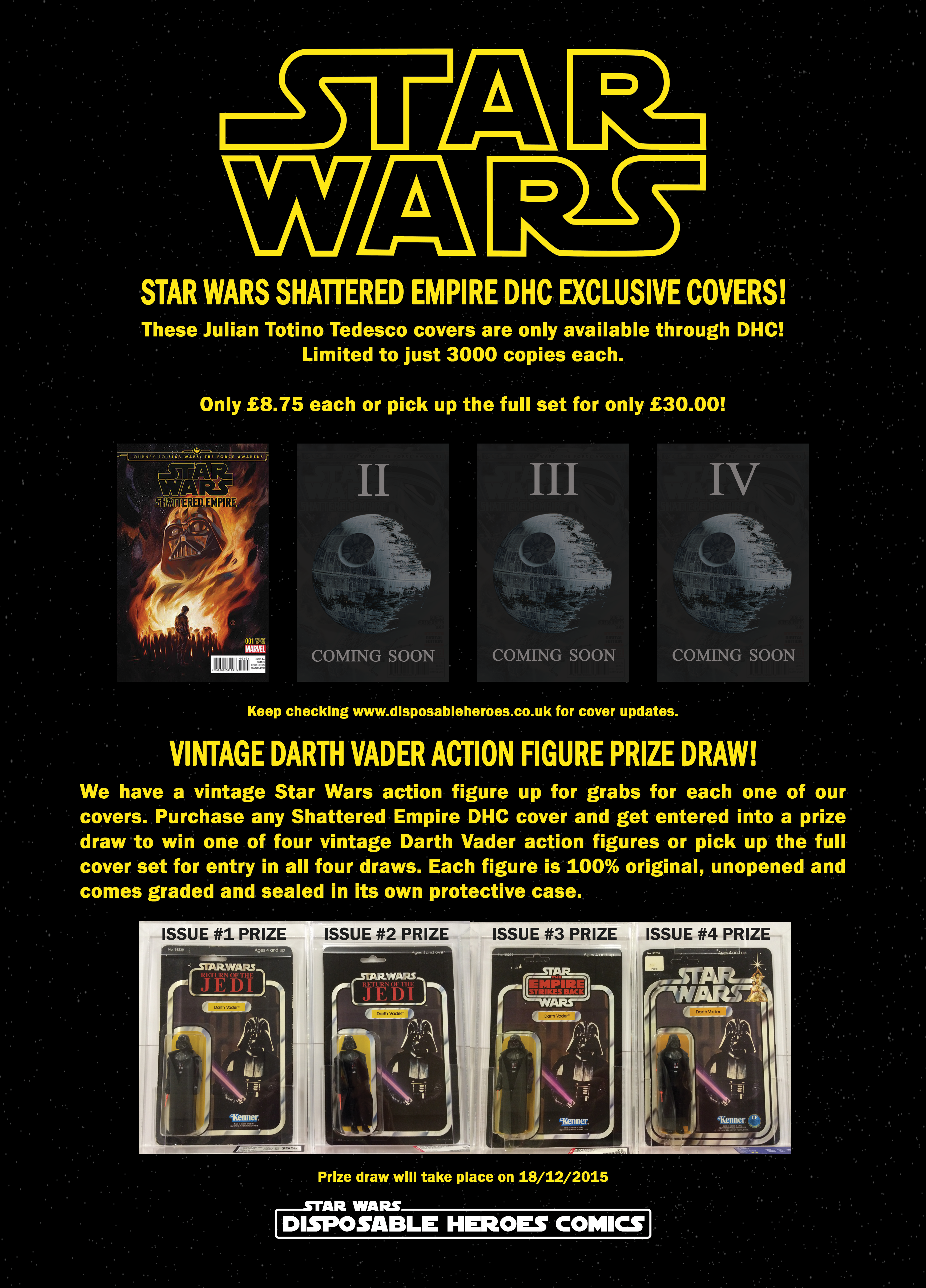 The U.K.'s Disposable Heroes Comics has revealed a Star Wars: Shattered Empire #1 variant cover by Julian Totino Tedesco. It's the first of four — Tedesco has created a variant cover for each issue of the miniseries, as explained in the flyer below.