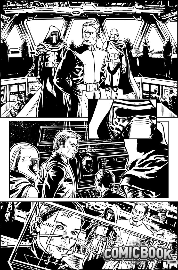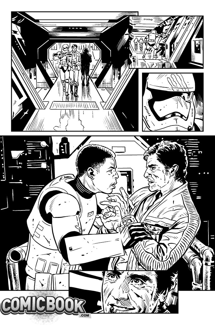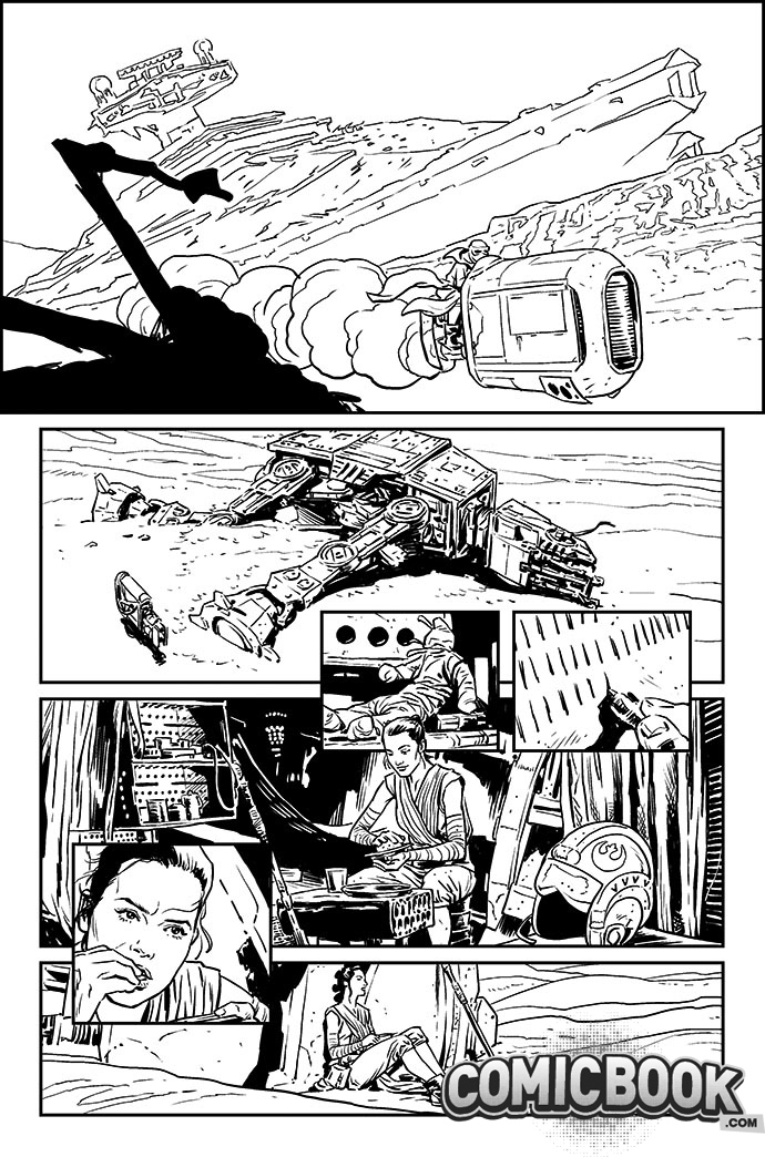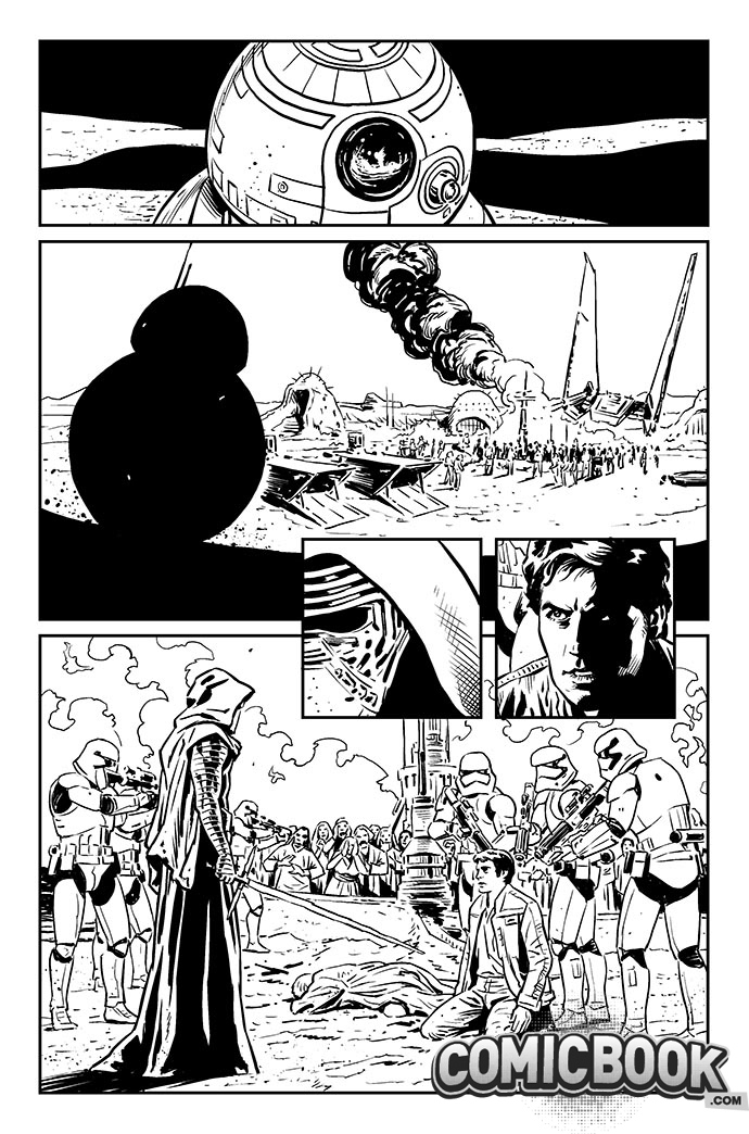 Marvel has revealed (via ComicBook.com) new preview images of their upcoming five-issue comic book adaptation of Star Wars: The Force Awakens, featuring art by Luke Ross. These pages haven't been finished yet (the coloring isn't done and the dialogue bubbles are nowhere to be seen), but they should give you an idea of what this series will look like and whether or not it's something you'll want to pick up. The first issue is due out on June 22, 2016.