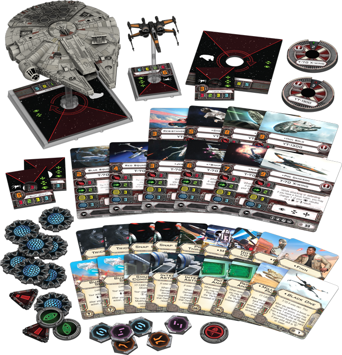 In addition to its new starship miniatures, Heroes of the Resistance introduces ten ship cards and eighteen upgrades, plus all requisite maneuver dials and tokens. These include a Poe Dameron with a pilot skill value of "9," ship cards for both Han Solo and Chewbacca that feature new pilot abilities, three new unique Resistance X-wing pilots, new elite pilot talents, new Tech upgrades, and unique Title upgrades for both the Millennium Falcon and Black One.