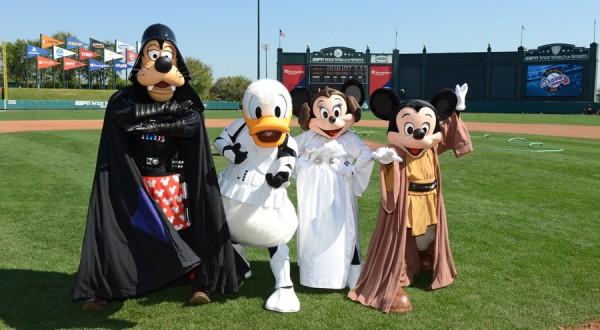 In other Disney – Star Wars synergy news, Mickey and his pals donned robes and wielded lightsabers to join the Atlanta Braves for spring training at ESPN Wide World of Sports Complex in Disney World.
