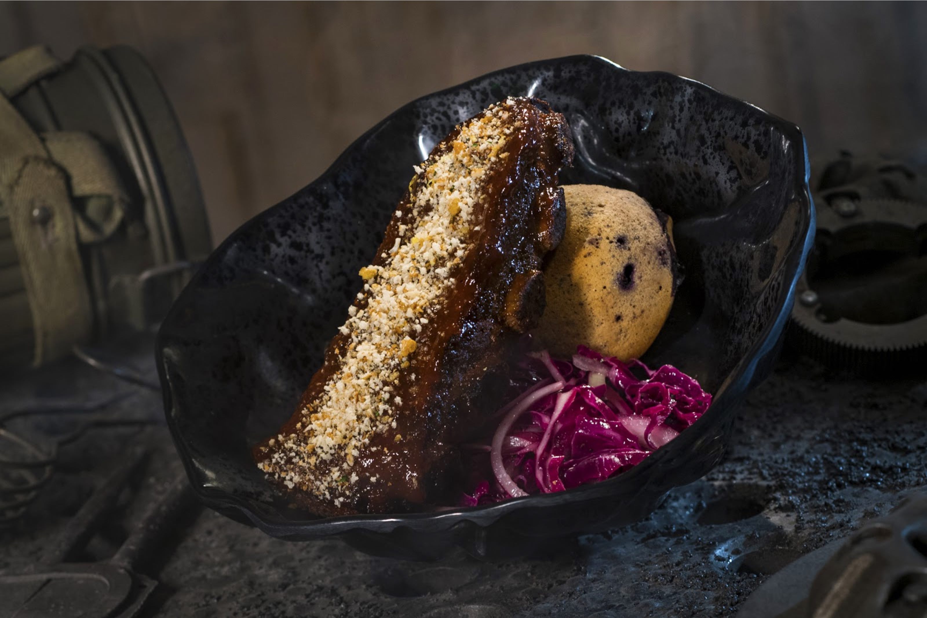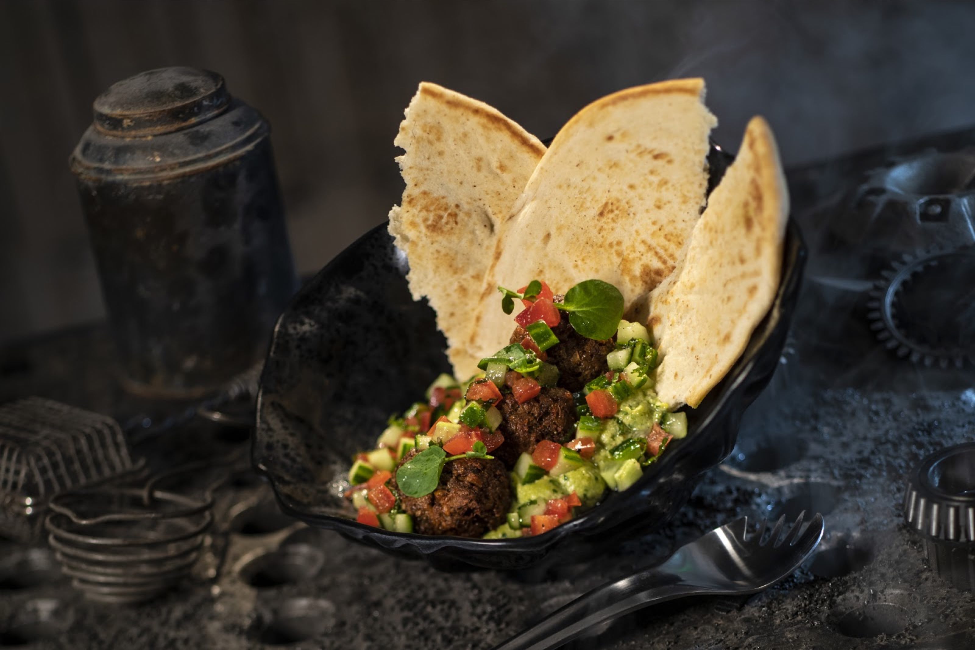 Ronto Roasters is an eatery where the food is cooked on ovens retrofitted from Podracer engines. Bakkar and his former smelter droid 8D-J8 provide some alternative food and beverage options, including the Ronto Wrap, Turkey Jerky, Tatooine Sunset, Sour Sarlacc, and Meiloorun Juice.