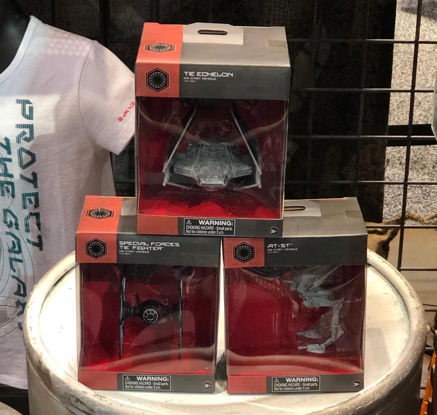 The First Order ships also get the spotlight with some cool little models and toy ships, including the new TIE Echelon that has a life-size version in Galaxy's Edge. You'll also notice that there aren'y any of the classic versions of the Empire TIE Fighters or the Scout Walkers. It's all the updated vehicles from the recent trilogy. So that's all in line with the Star Wars universe.