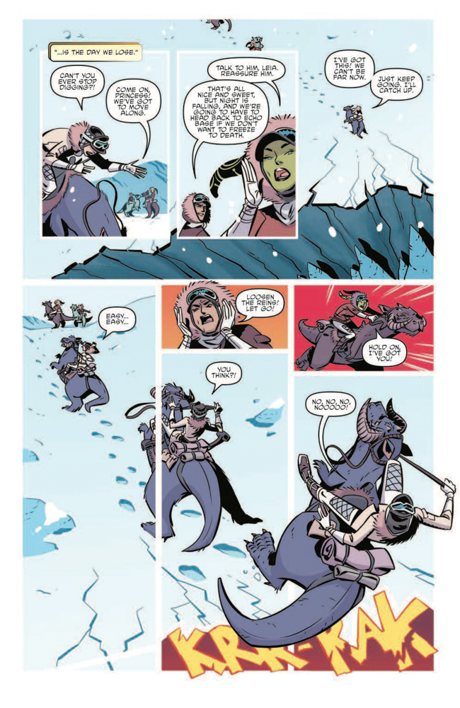 As you can see, the Twi'lek rebel Hera Syndulla is accompanying Leia Organa and Han Solo across the icy planet on tauntaun. However, the princess is having some trouble staying in control of her companion, prompting plenty of sarcasm from Han, and some patient advice from Hera. But it looks like there might be danger in store for Leia when some breaking ice freaks out her tauntaun near a cliffside.