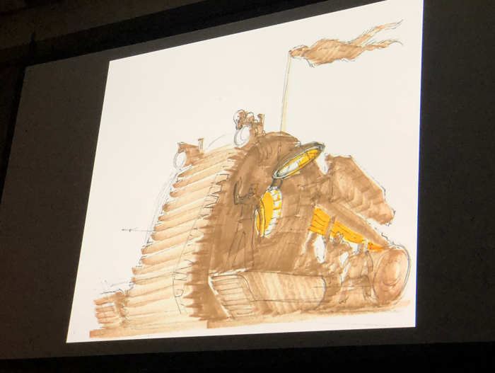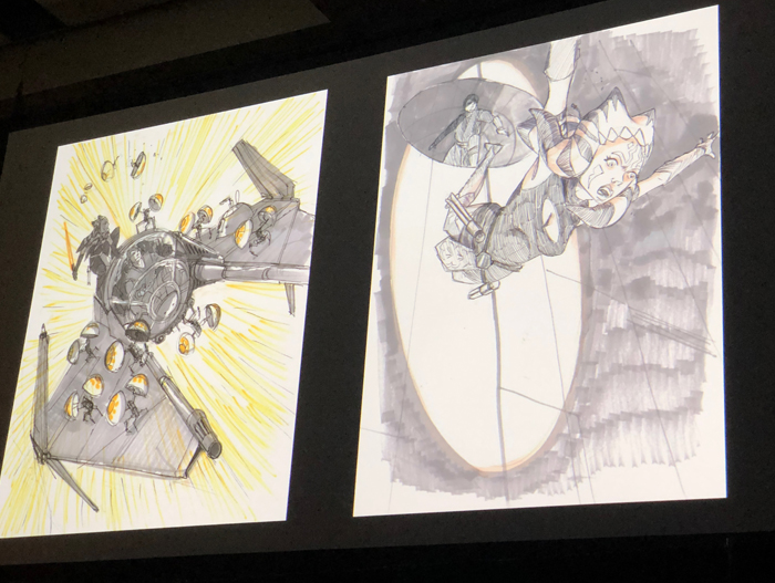 Dave Filoni showed off never before seen sketches he put together during the production of the series. The sketches were done on the day during the story sessions while they were talking it out with George. In one of the images, we see a sketch of a little baby Plo Koon that Filoni pitched but George turned down. Filoni sketched George saying no next to the drawing of baby Plo. Other artwork showed Cad Bane in an arc that didn't get produced and alternate starship artwork, including one that was almost Ventress's ship. We saw some sketches from The Bad Batch, which was released online as a story reel but never rendered. One tank-like vehicle had a Wookiee pelt hanging as a flag.