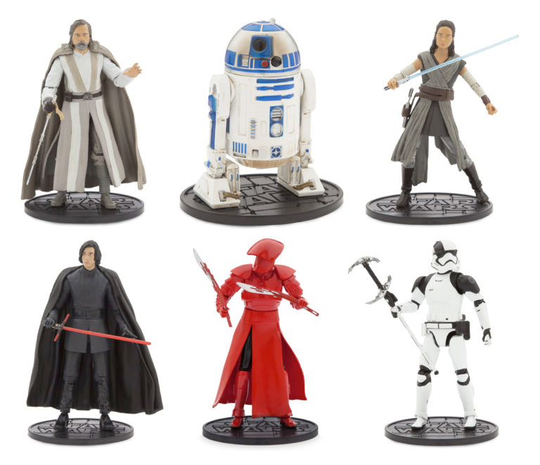 Star Wars Elite Series Die Cast Action Figures inspired by Star Wars: The Last Jedi (characters included: Kylo Ren (unmasked), Rey, Luke Skywalker, First Order Judicial Stormtrooper, Praetorian Guard, R2-D2). A premium line of die cast action figures featuring characters inspired by Star Wars: The Last Jedi. Available exclusively at Disney Store, DisneyStore.com, and Disney Parks.