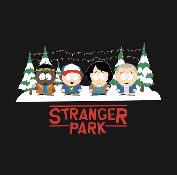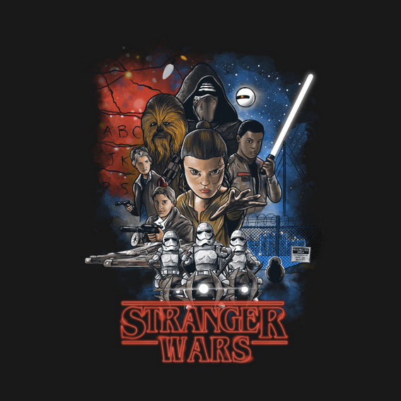 Some new shirts paying tribute to Stranger Things and mashing the show up with other beloved properties have popped up over at Shirtoid. The four boys from the show get a South Park makeover in one shirt while Eleven is turned into Rey in a mash-up with Star Wars: The Force Awakens. In addition, the cool font of the title design is used to create a shirt showing love for waffles that only fans of the show will understand. But my favorite recent shirt out of the bunch is the retro Hawkins, Indiana shirt.