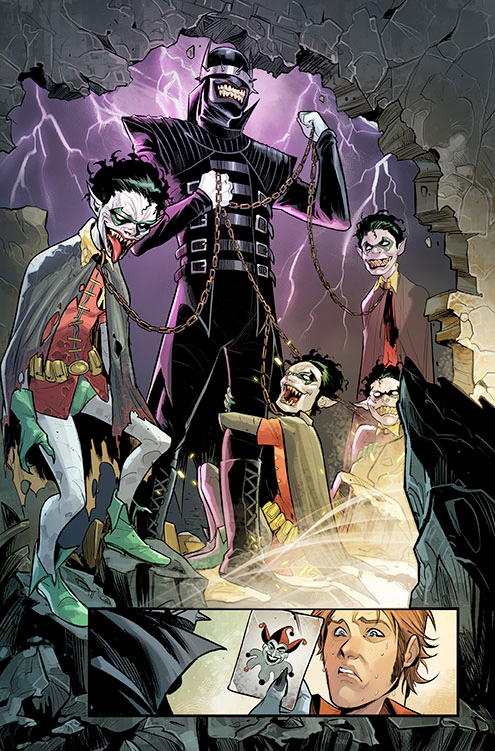 "The Batman Who Laughs" is a twisted version of The Joker as Batman with a bunch of creepy Robins with him.