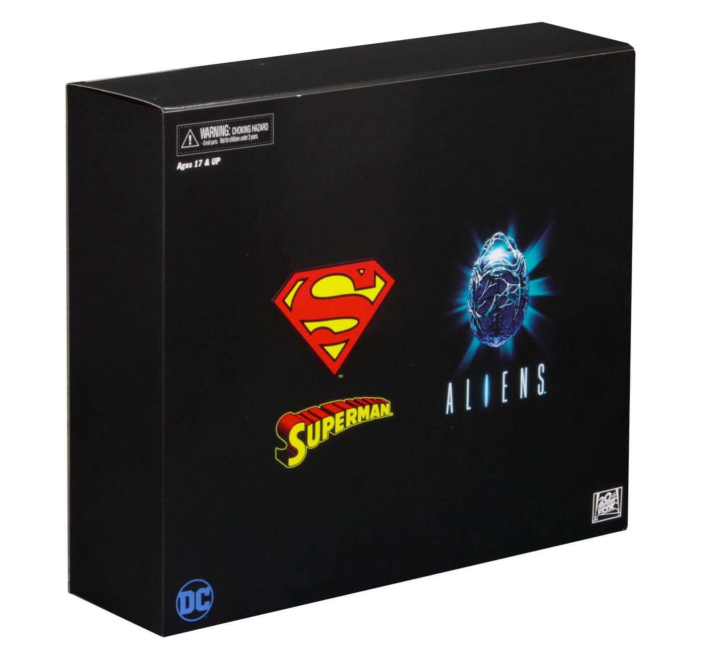 The set includes two brand new, comic book based figures, both with over 30 points of articulation. Superman stands approximately 7" tall, features a fabric cape and comes with attachable eye blast effect. The Alien stands approximately 9" tall and has a bendable tail.