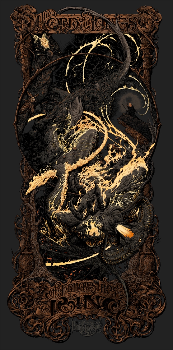 UPDATE: Badass Digest also revealed Aaron Horkey's poster for The Lord of the Rings: The Fellowship of the Ring. This comes after he'd already done posters for Return of the King as well as The Two Towers. It's a poster long anticipated. Here are the regular and variant editions.