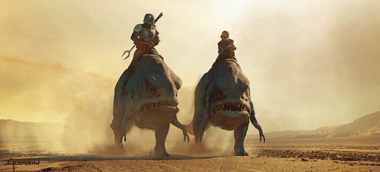 Artist Christian Alzmann created both of these pieces with Mando and Kuiil riding Blurrgs. These creatures looks like giant goblins, and the way they were brought to life in the series makes us wonder how much of them is practical and how much is a digital effect.