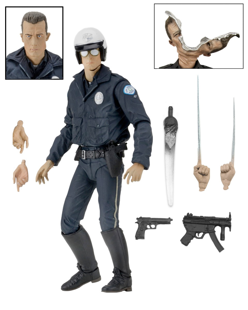 Continuing their Terminator 2: Judgment Day action figure line, NECA has unveiled their ultimate 7-inch motorcycle cop version of T-1000. The detailed likeness of Robert Patrick has a fully articulated body and a slew of accessories that allow you to recreate some of his best scenes from the movie. The accessories include interchange heads and hands, including a bladed arm, a pistol and a machine gun.
