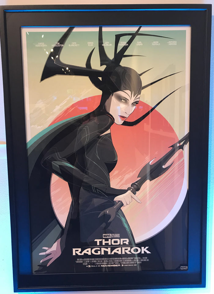I'm especially fond of artist Dan Mumford's Ragnarok, the super colorful piece that features Loki, Valkyrie, Hulk, and Thor facing down Hela on the rainbow bridge with Asgard looking like Oz in the background. (Fans outside of Los Angeles can purchase that piece, as well as other merch, at FandangoFanShop.com.) And fine, twist my arm, but my favorite of the whole bunch is Kevin M Wilson/Ape Meets Girl's Hammertime, which has picture-perfect reproductions of the actors' likenesses coupled with the awesome image of Cate Blanchett's Hela holding Mjolnir in her hand while the heroes stand atop it. What a cool design. But damn it, Kimchicat's Hela, in which that character looks like a classic animated Disney villainess, is excellent as well. Don't make me choose!