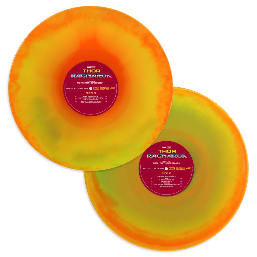 The Thor: Ragnarok vinyl soundtrack is a 2XLP release featuring Mark Mothersbaugh's score on vinyl for the first time ever. You can grab the vinyl release in the standard 180-gram black vinyl. Or if you're looking for something a little more colorful, you can pick it up in a neon swirl vinyl featuring yellowish orange and green or in a Thor vs Hulk color variant with each of the records representing the colors of the two Avengers in the Contest of Champions battle arena. Each of the Thor: Ragnarok vinyl soundtrack releases comes with stunning artwork by Yuta Onoda.