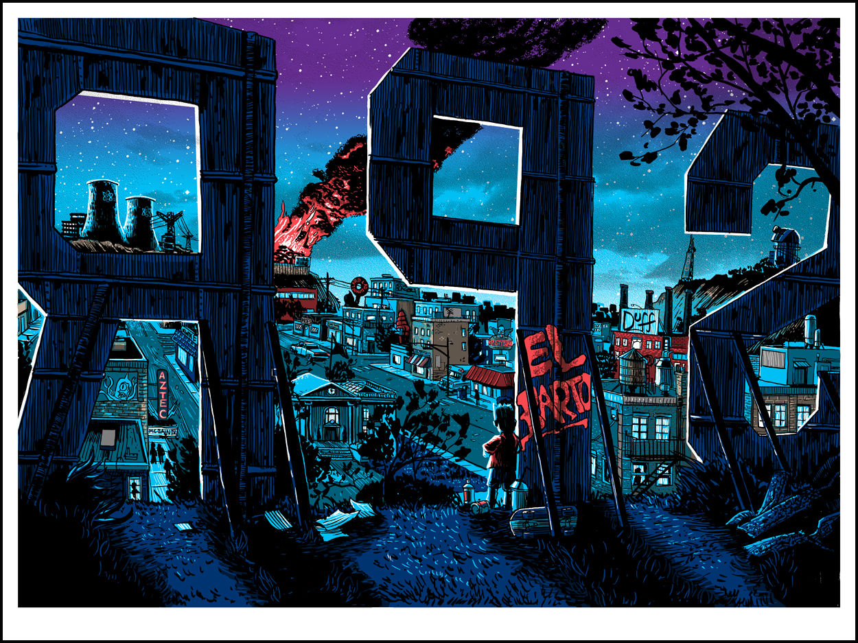 Austin-based artist Tim Doyle has been making posters of The Simpsons for years. Most of them are part of his three Unreal Estate exhibits. Today, he's released what could potentially be his final look at the legendary show. He and Spoke Art have released "Springfield," an 18 x 24 inch screenprint available either in either a regular or glow in the dark edition. It's on sale now, but don't rush. It's an open edition. They'll print them as long as people buy them. Check out all the images below.