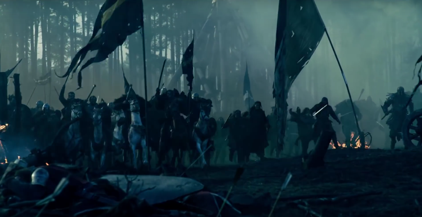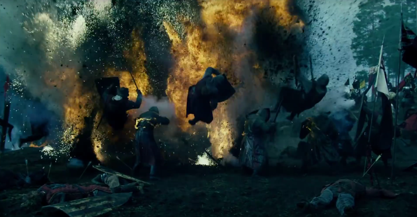 These two shots from medieval times. There are knights charging with flags and swords, riding horses, showing that this is clearly from the flashback sequences we previously heard about involving Liam Garrigan as King Arthur.