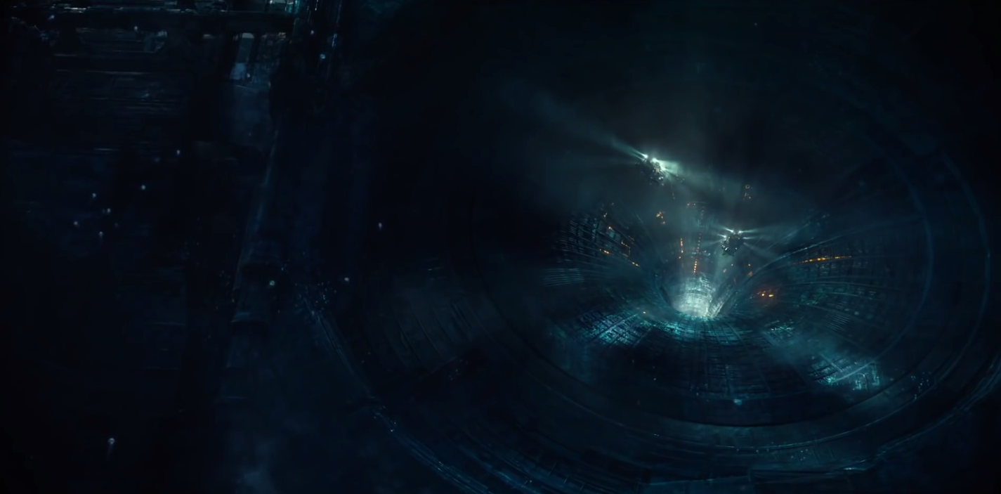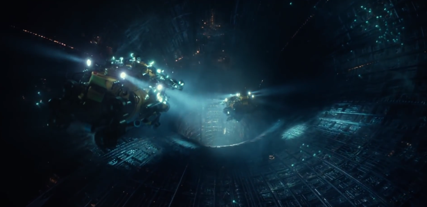 Now what the hell is this? When looking at the possible answers of why Optimus Prime is fighting Bumblebee, the possibility of Unicron manipulating the Autobot was floated, and that surface with a giant hole in it looks like it could easily be the planet-sized Transformer. On the other hand, we know that there's some kind of big underwater sequence involving a massive anomaly and a submarine Transformer, and these shots look like they could be deep in the ocean, especially the way those vehicles are circling.