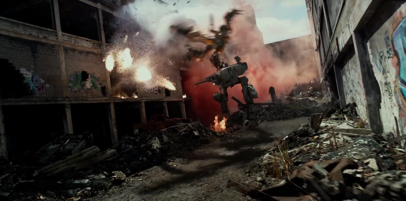 A wide shot shows off more of the explosions that Michael Bay puts all over his movies. Where is this sequence taking place, though? Those hexagonal structures in the ground look covered in metal, not unlike Transformers technology, so where could this be? Maybe it's on one of those giant chunks of something we saw in space earlier.