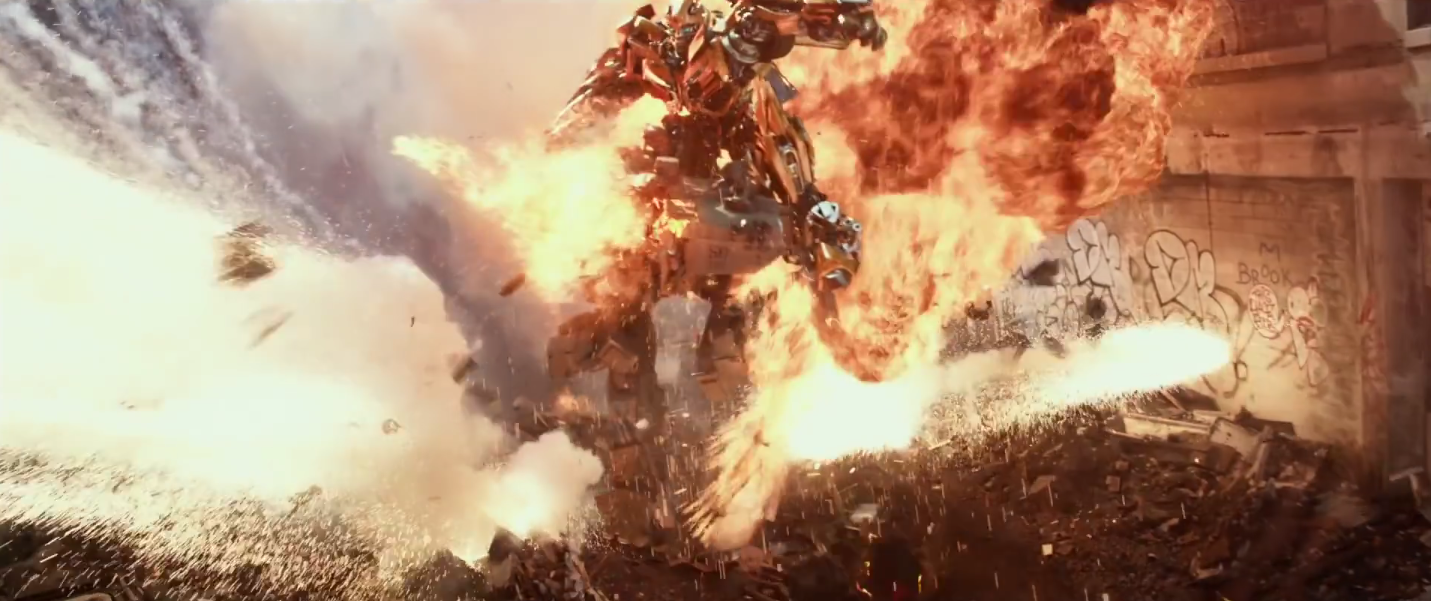 A cut to an action shot. That's Bumblebee jumping through the air at a drone belonging to the Transformers Reaction Force. Franchise newcomer Santiago Cabrera controls one of those and mentioned getting into a scuffle with Bumblebee in the movie. That appears to be what we're seeing here, and the Autobot has no problem dispatching with the human-controlled weapon.