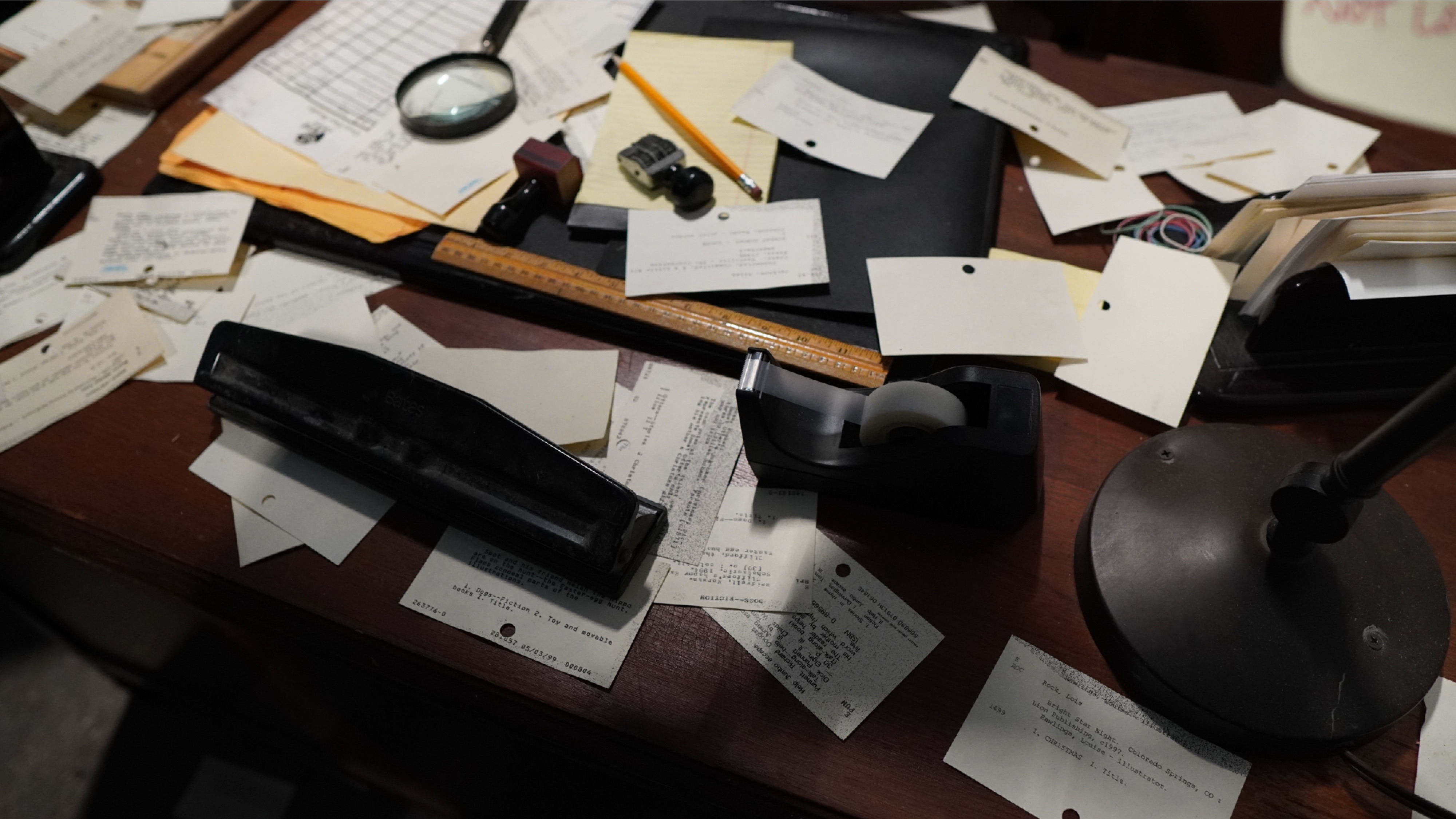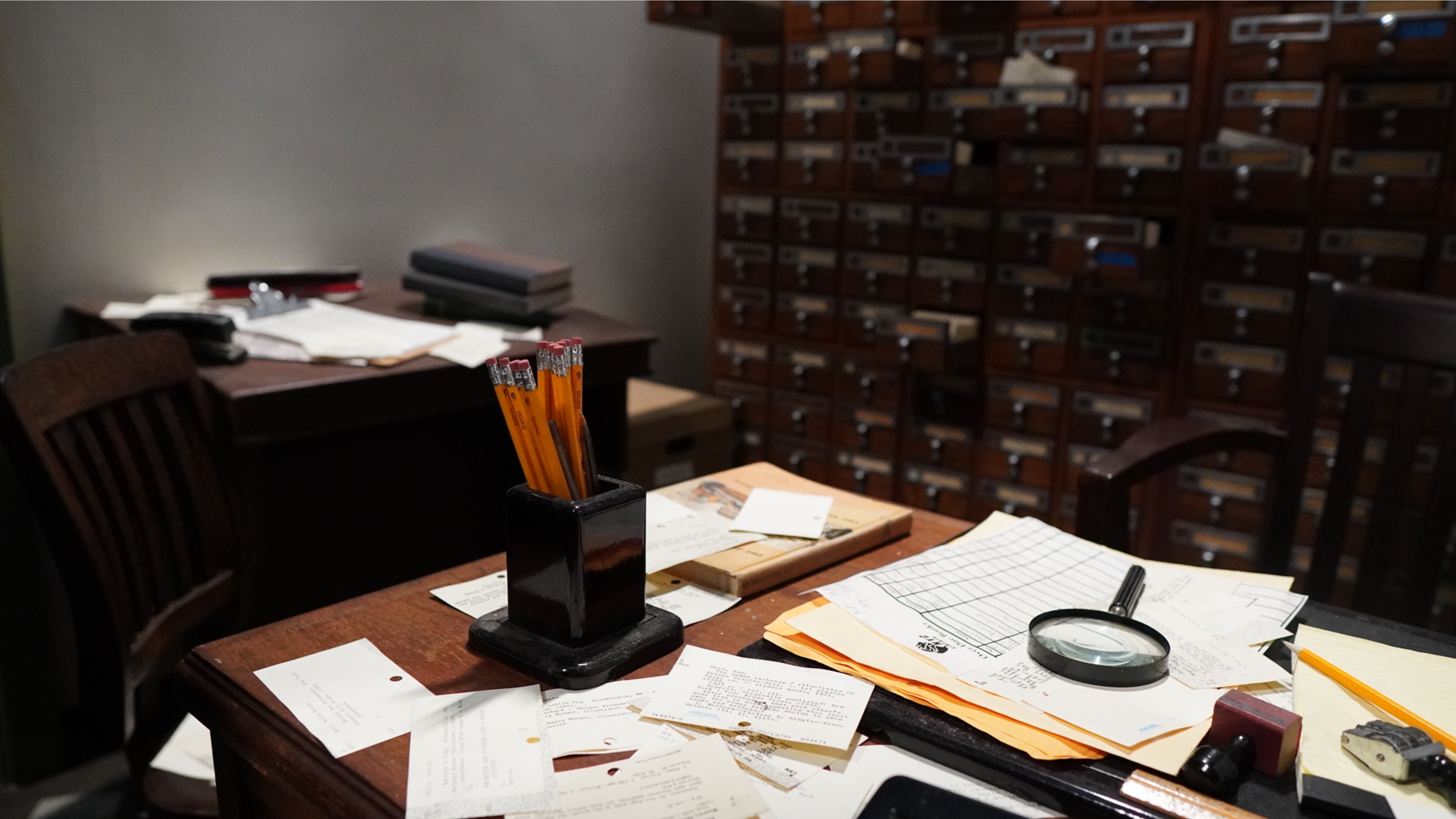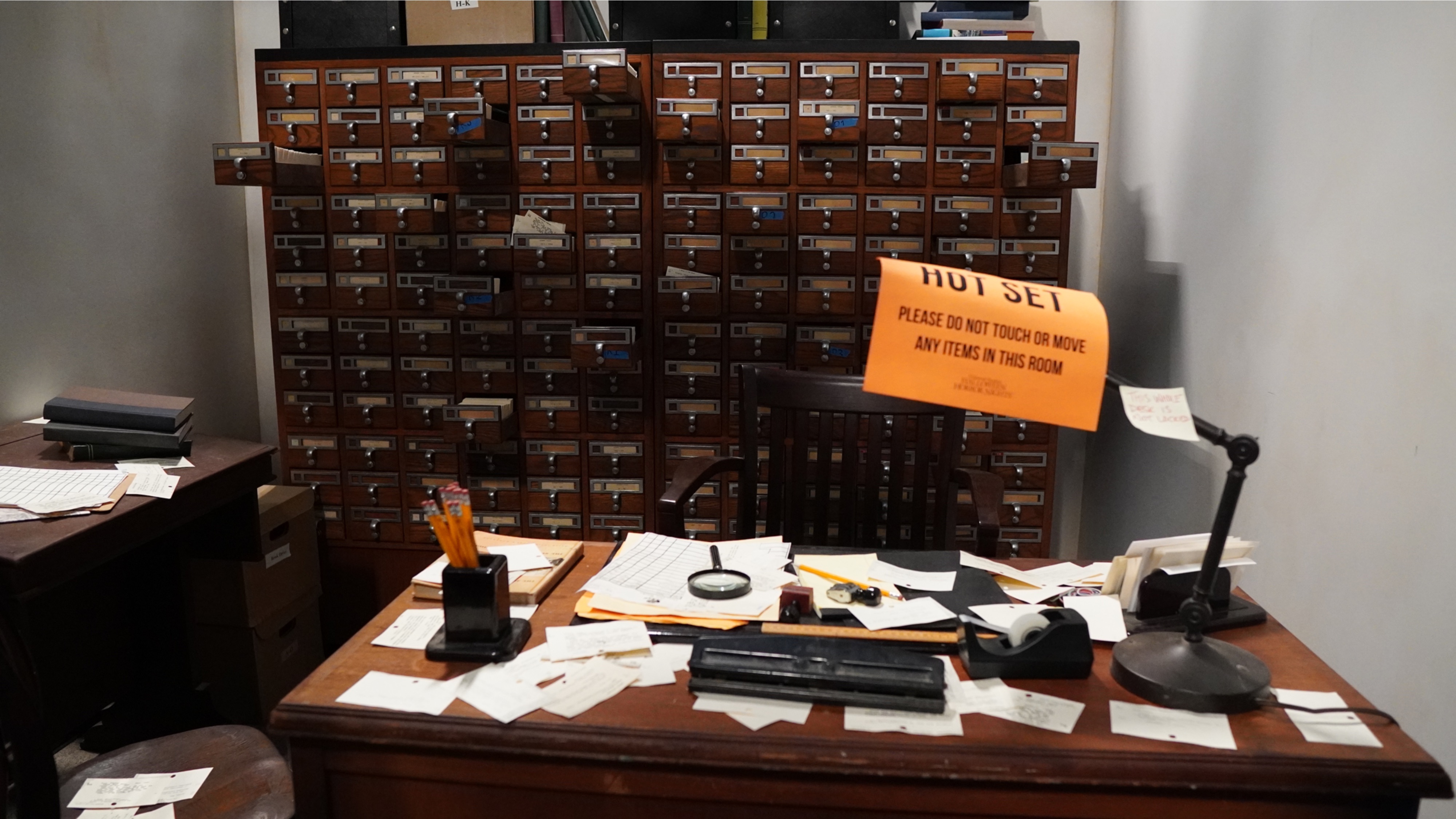 Books are stacked up on one wall and card catalogs are opening and closing on the other, controlled by a scare actor in another room who is seeing a video feed and moving the card catalogs to hopefully scare guests.