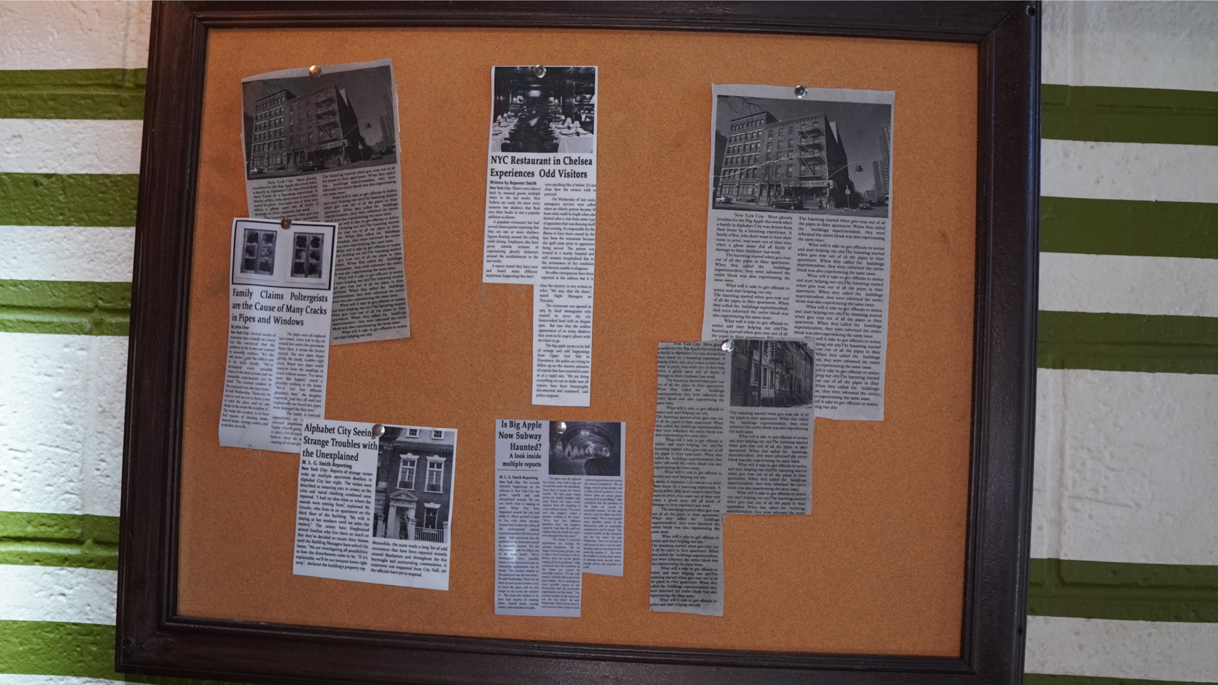 Behind the card game, we will see two ghosts, Sparky (from the subway) and Gertrude (the puking woman in the picture frame). Sparky's head will appear to lift off his shoulders and start floating around the room. The same will happen with the half top of Gertrude's body. This is accomplished with a black background and performers wearing black. For example, there is a complete shell of Sparkys body and the scare actor is wearing black except for his head. Against the black background and in the proper lighting, it will look like the head leaves his body and floats on the air.