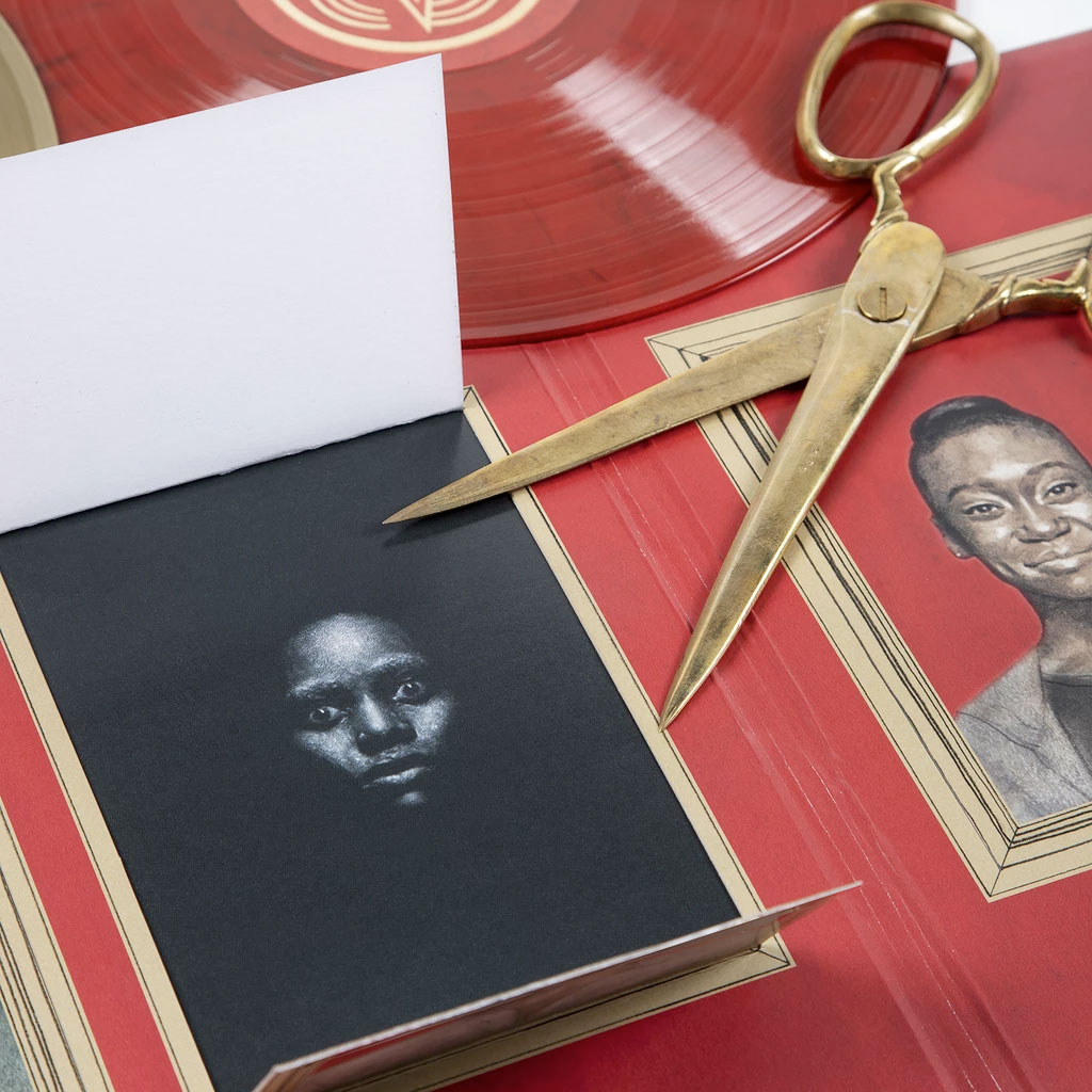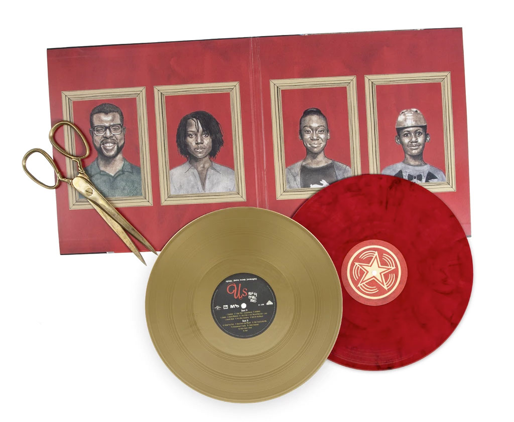 The Us vinyl soundtrack comes with a Metallic Brass Scissors colored vinyl for the first disc and a Tethered Red Jumpsuit colored vinyl for disc two, each containing the score composed by Michael Abels. They're housed in a jacket featuring the art of illustrator Edward Kinsella, and inside the gatefold jackets there's even "interactive" packaging with requires collectors to actually cut part of the gatefold to reveal the terrifying Tethered hiding behind the happy family portraits of the film's main characters.