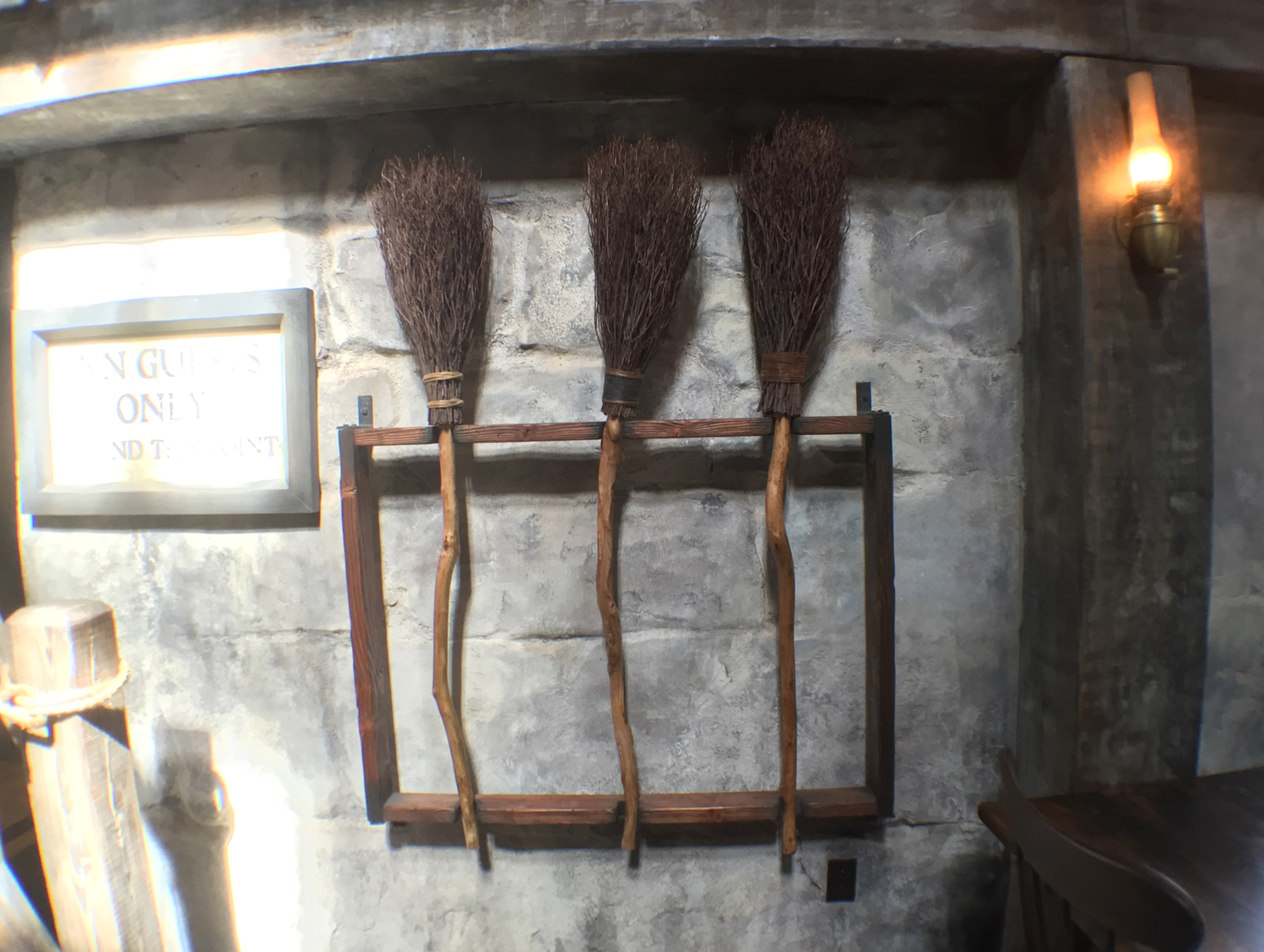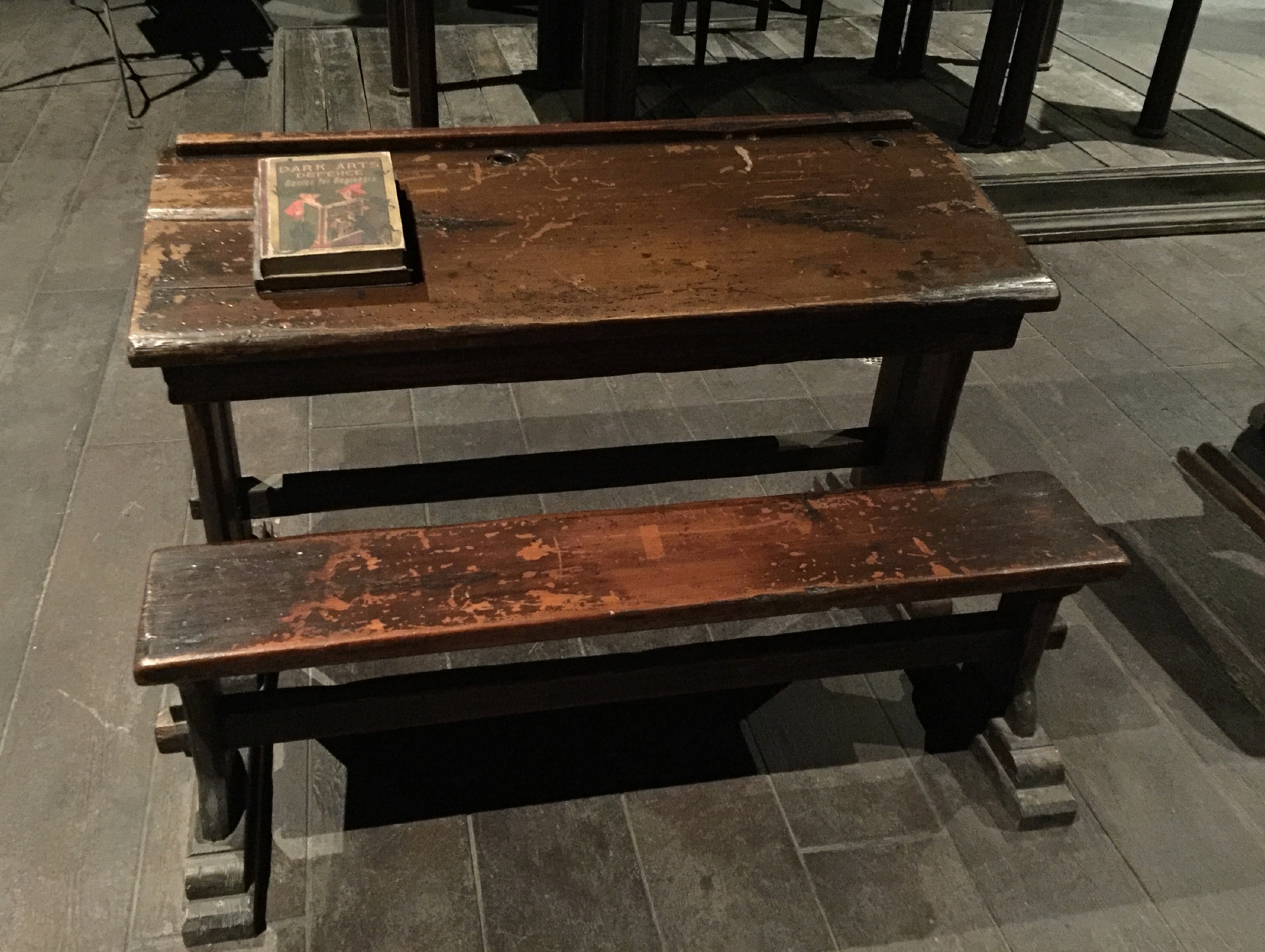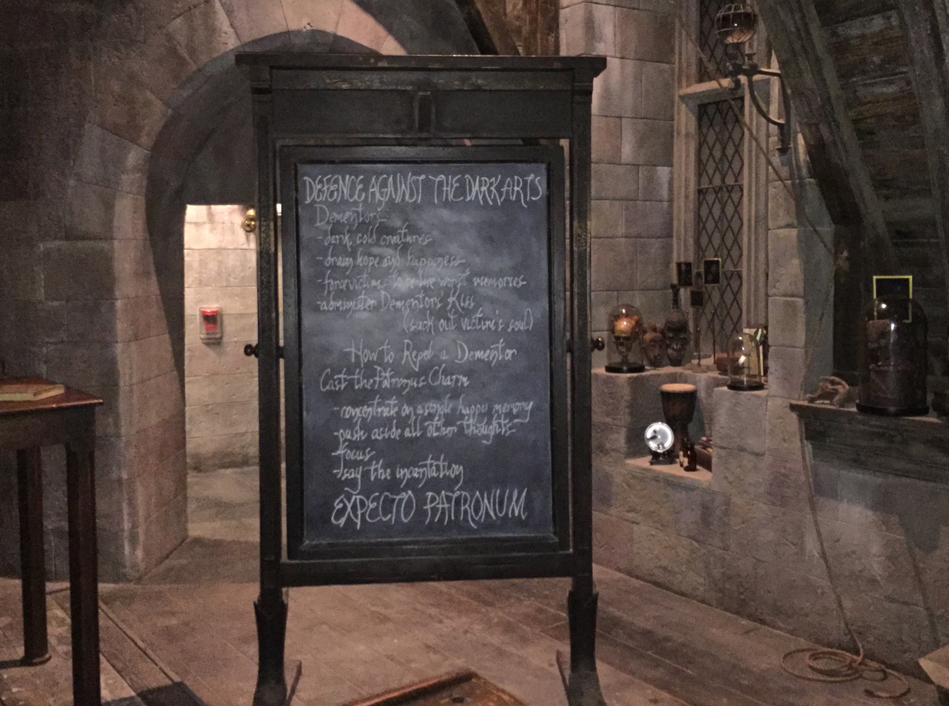 Other screen-used props from the Harry Potter films are also scattered throughout the land, including some background brooms on the wall in the Three Broomsticks tavern and the actual desks and chalkboard from the Defense Against the Dark Arts classroom inside Hogwarts (in the queue for the Harry Potter and the Forbidden Journey ride). As Gilmore says: