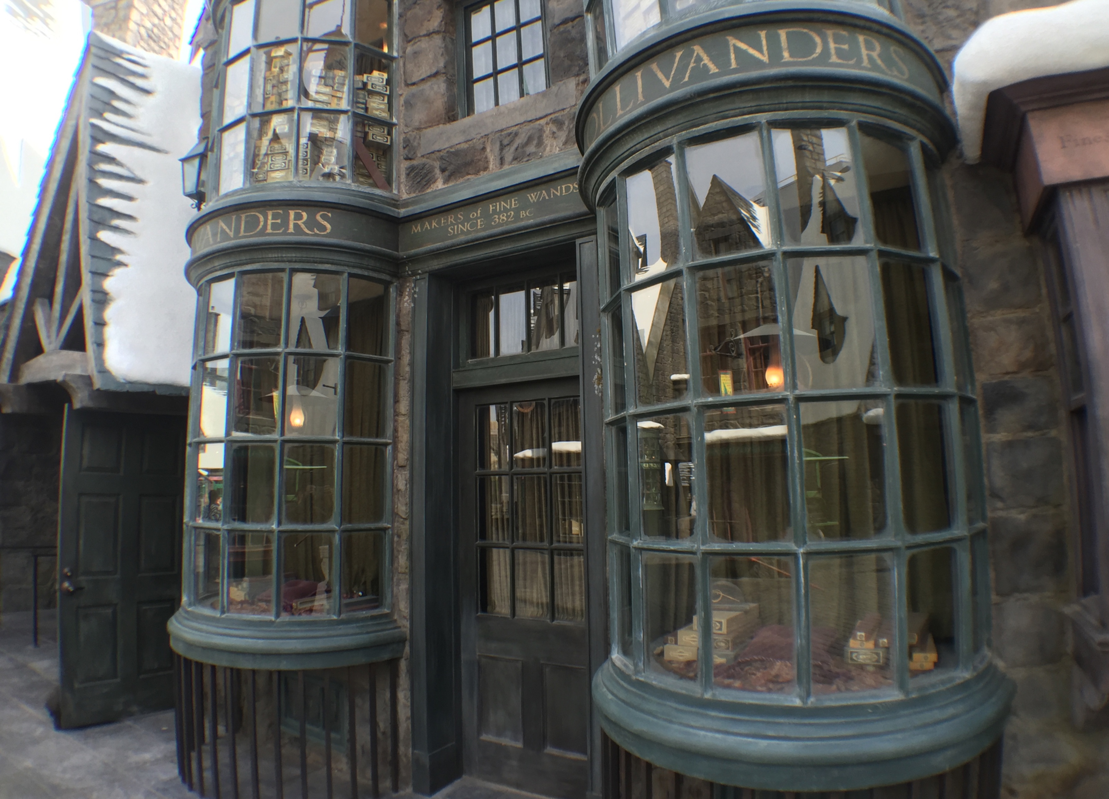 Ollivanders has its own building in Universal Hollywood, dwarfing the smaller version seen in Orlando. This version of Ollivanders introduces a large lobby room, with shelves filled with wands from floor to ceiling. After waiting in line around the corner, guests will be granted entrance to the lobby, which will begin to tell the story of Ollivanders and allow the park guests to avoid the California heat outside. One of the many things J.K. Rowling pushed for in this iteration was to hide lines of any kind from the main street.